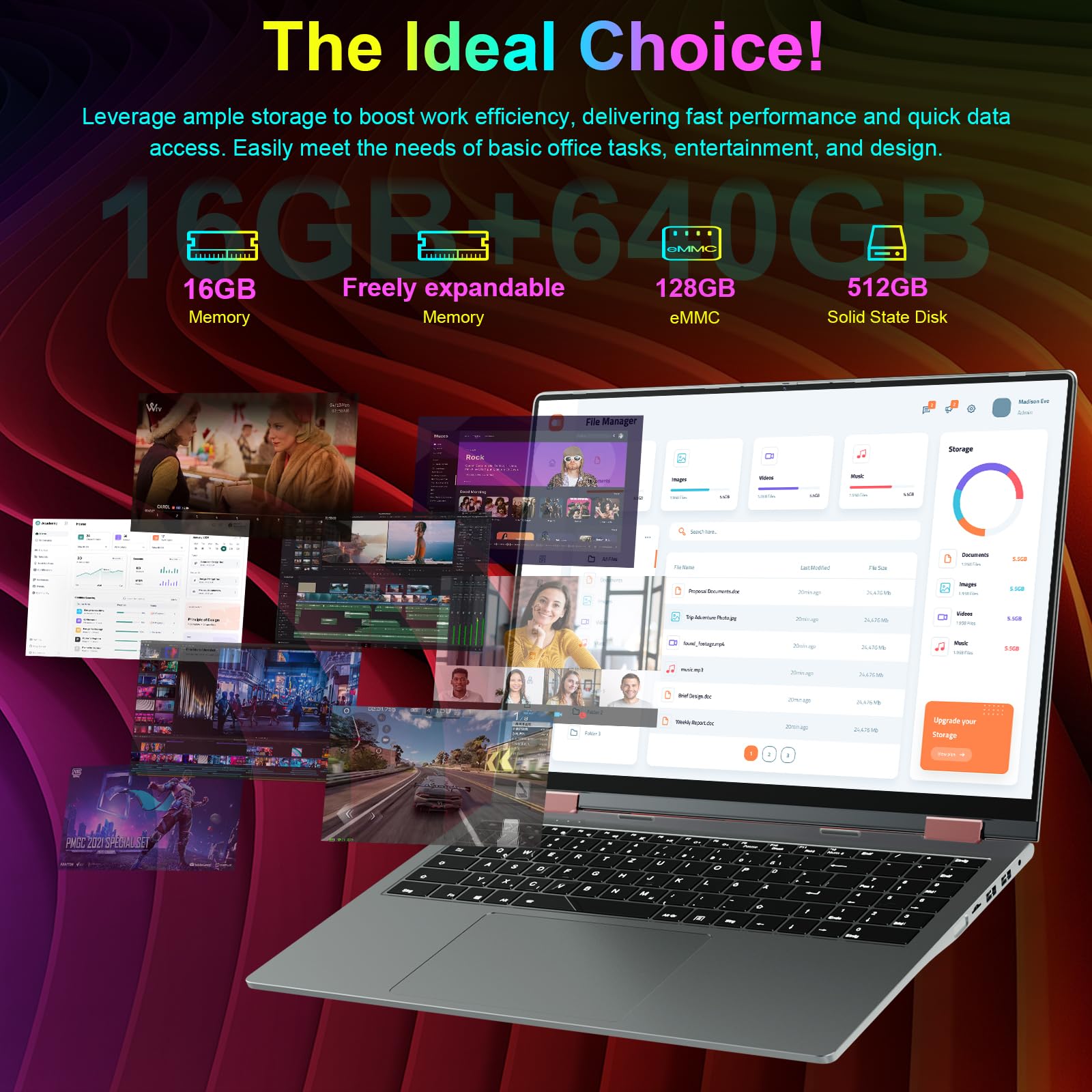 • Erweiterbarer Speicher: Dieses Touchscreen Laptop verfügt über 16GB DDR4-RAM und einen zusätzlichen Steckplatz für bis zu 16GB. Es bietet 128GB eMMC sowie eine 512GB SSD, die auf 2TB aufgerüstet werden kann, und erfüllt alle Speicheranforderungen