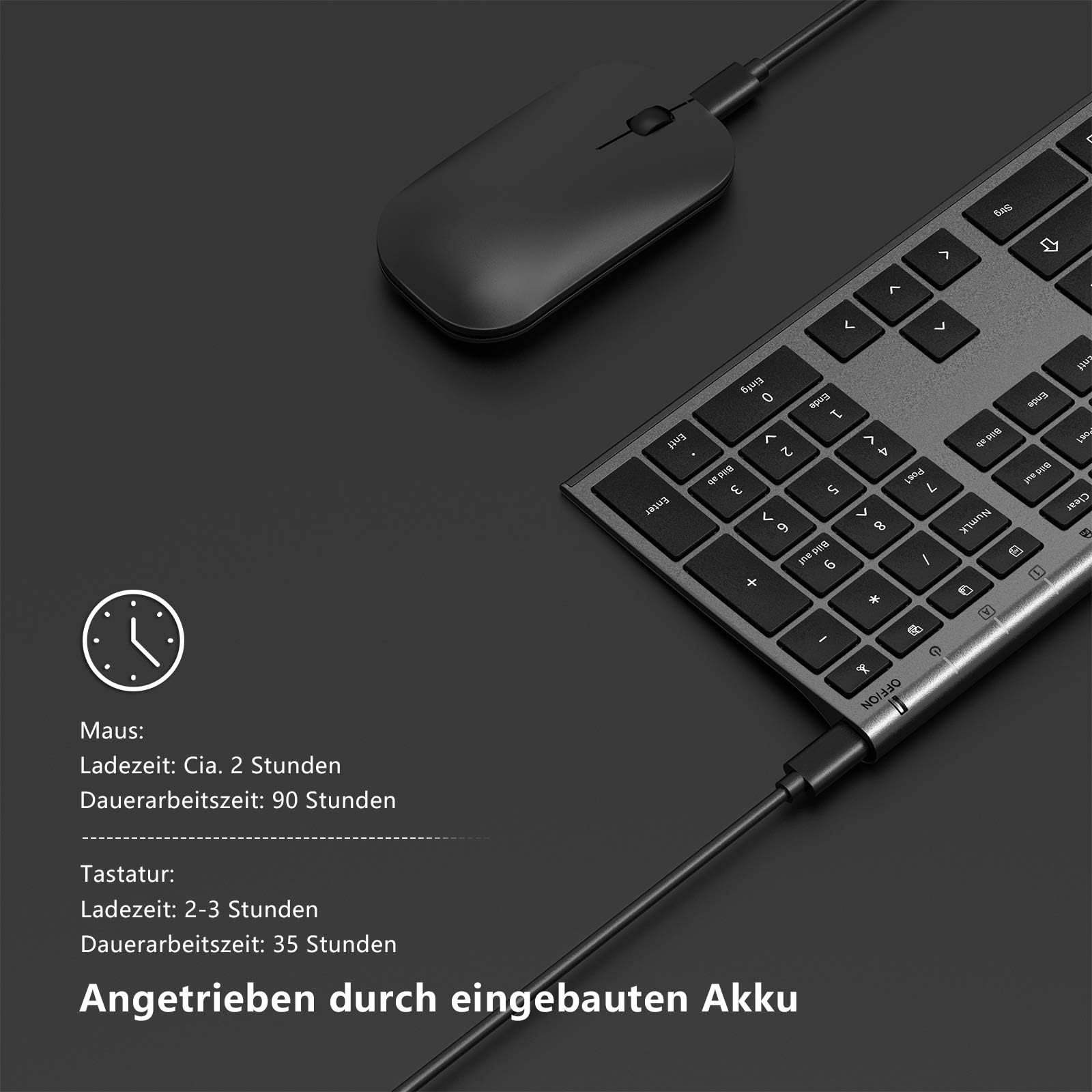 - Lange Batterielebensdauer: Die kabellose USB-Tastatur und -Maus hat einen 280-mAh-Akku zum Aufladen und kann 35 Stunden ununterbrochen lang arbeiten, nachdem sie 2-3 Stunden aufgeladen wurde. Die Stand-by-Zeit beträgt ca. 1 Monat.