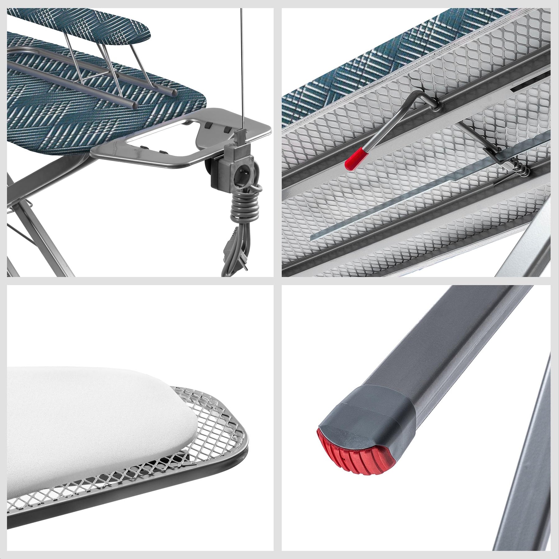 - Stabil: das kompakte Bügelbrett ist mit einem System ausgestattet, das das zufällige Zusammenklappen verhindert. Die Beine wurden mit einer rutschfesten Schicht bedeckt.