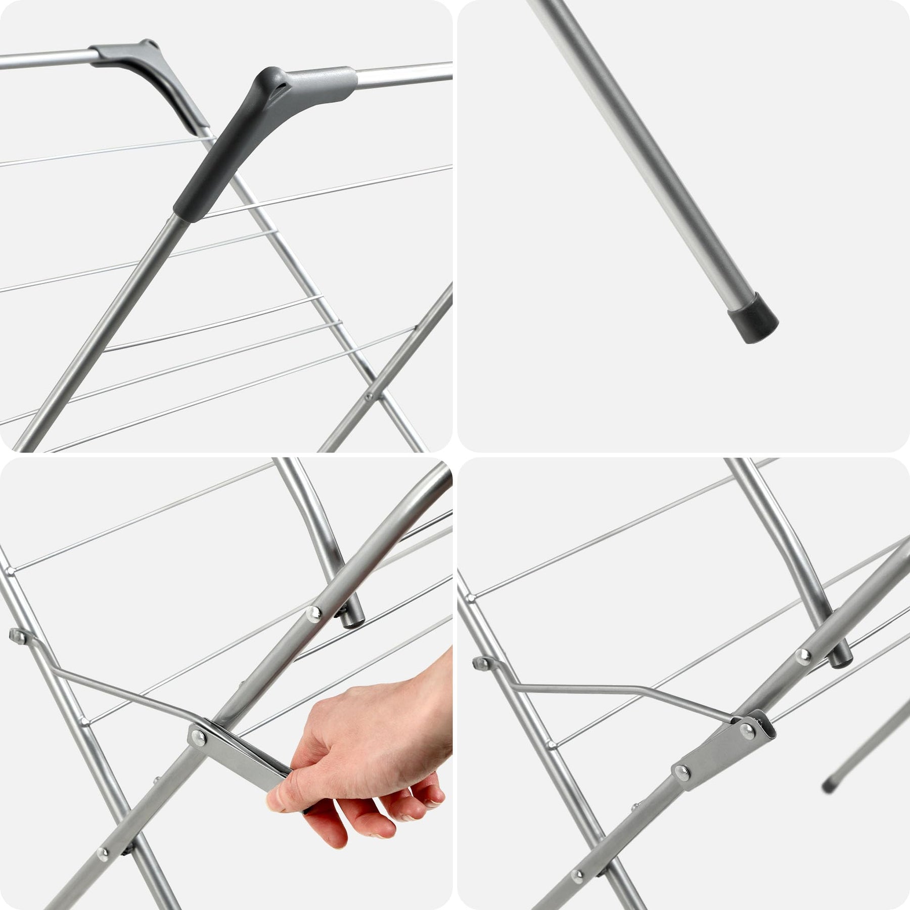 • Praktische Anwendung: Der Wäschetrockner kann in jedem Raum und auf jeder Art von Oberfläche eingesetzt werden. Er verfügt über rutschfeste Teile an den Füßen, was Stabilität und Schutz Ihres Bodens vor Kratzern garantiert.