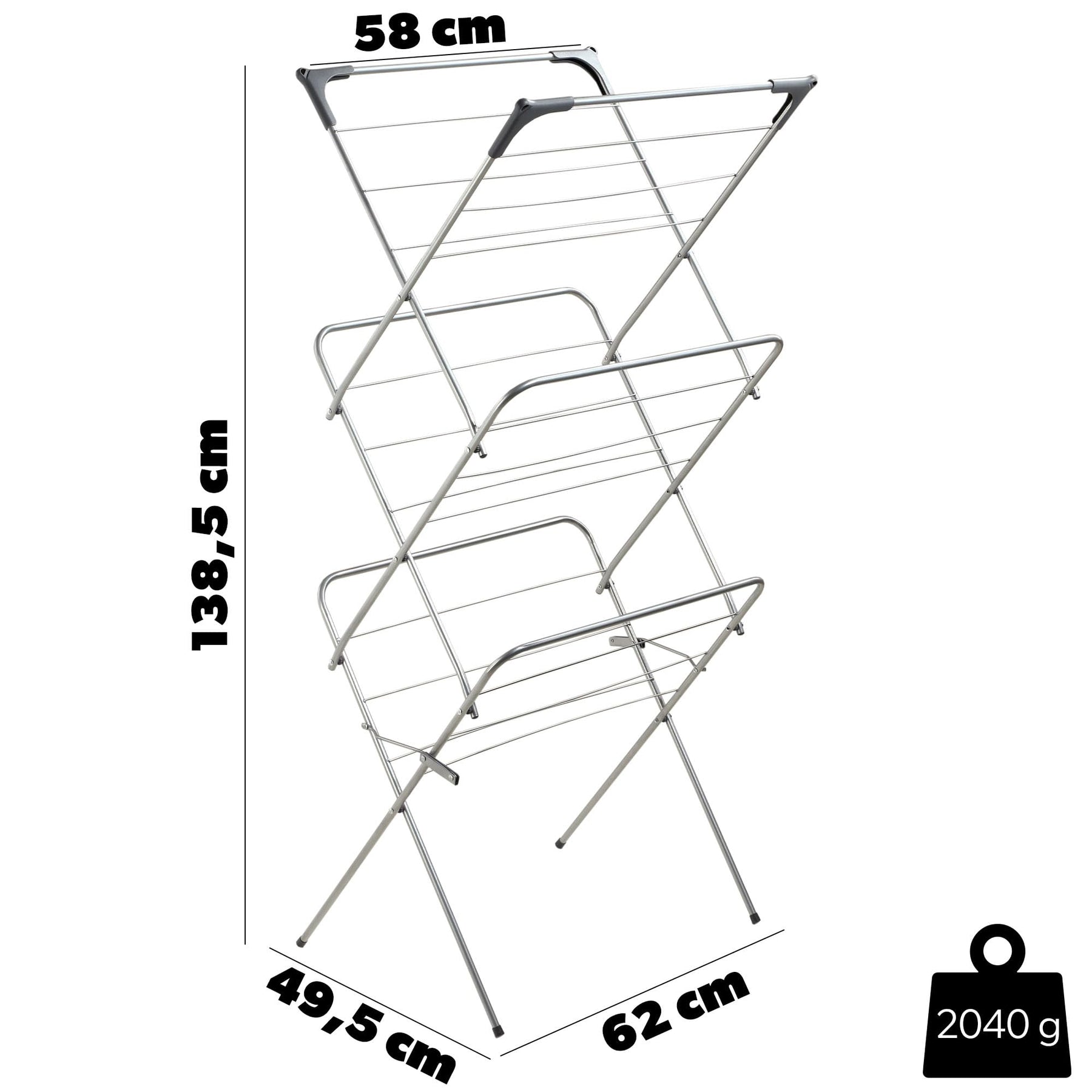 Die Gesamtabmessungen des Turmwäscheständers betragen 62x49,5x138,5 cm (LxBxH). Damit bietet er Ihnen 14m Trockenfläche, was eine ideale Wahl für alle ist, die Funktionalität schätzen. Mit einer Belastbarkeit von 6 kg ist er die perfekte Wahl für Mehrgenerationen-Familien oder Haushalte mit vielen Bewohnern, die schnell große Wäschemengen aufhängen müssen. Erleichtern Sie Ihre tägliche Arbeit mit praktischem und langlebigem Zubehör und entscheiden Sie sich für den Wäschetrockner Malbo!