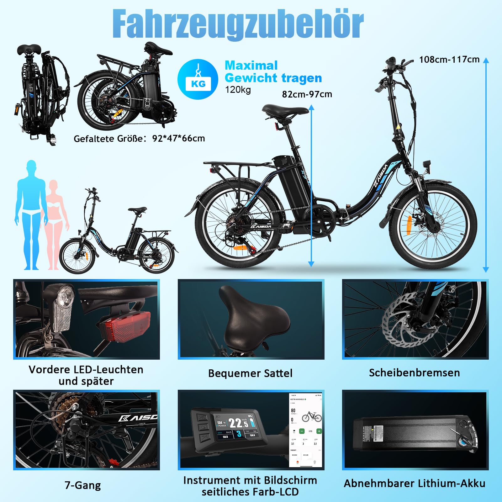 • 【😎Leichter und stabiler Rahmen】Das KAISDA E-Bike Klapprad 20 zoll ist aus einer Aluminiumlegierung gefertigt und kann eine maximale Last von 120kg erreichen und wiegt nur 24 kg. Die Vordergabel stoßgedämpft ist und der verstellbare Sitz und Lenker für eine reibungslose Fahrt sorgen und Anpassung an Menschen mit unterschiedlichen Körperformen