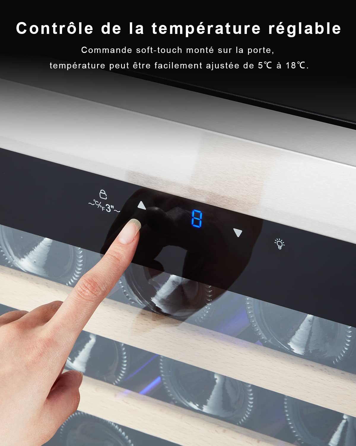 - KOMFORTABLE BEDIENUNG: Mit Touch-Bedienfeld einstellbare Temperaturen von 5 bis 18°C, und zuschaltbare Blaue LED-innenbeleuchtung. Welches durch die gehärtetem Glastür schimmert, gibt dem Weintemperierschrank und dadurch auch dem ganzen Raum gerade noch zusätzlich Atmosphäre.