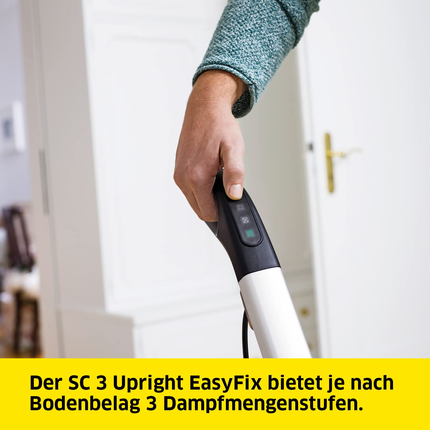 Einzelheiten: Der Dampfreiniger Kärcher SC 3 Upright EasyFix kann auf allen Hartböden im Haushalt eingesetzt werden. Nach einer Aufwärmzeit von 30 Sekunden ist der Dampfreiniger sofort einsatzbereit. Das Gerät verfügt über eine LED-Heizungsanzeige am Griff, die den aktuellen Zustand anzeigt. Wenn das Licht rot ist, wärmt sich der Dampfreiniger auf. Sobald die Ampel grün leuchtet, ist das Gerät betriebsbereit. Am Griff befindet sich auch ein Bedienfeld, mit dem Sie den zu reinigenden Bodenbelag auswählen können. Drei Optionen stehen zur Auswahl: Der Holzmodus ermöglicht die Reinigung von Holz-, Laminat- oder Parkettböden. Fliesen und Steinböden können mit dem Fliesenmodus gereinigt werden. Der Teppichmodus ist ideal für die Dampfreinigung von Teppichen. Die Dampfmenge wird automatisch an jeden Bodenbelag angepasst. Bei einer gründlichen Reinigung beseitigt der Dampfreiniger bis zu 99,99 % der Viren* und Bakterien** auf Oberflächen. Der Dampfreiniger hat einen abnehmbaren Tank, der bis zu 0,5 Liter Wasser aufnehmen kann. Ein voller Tank und 1600 W können bis zu 60 m² Fläche reinigen.