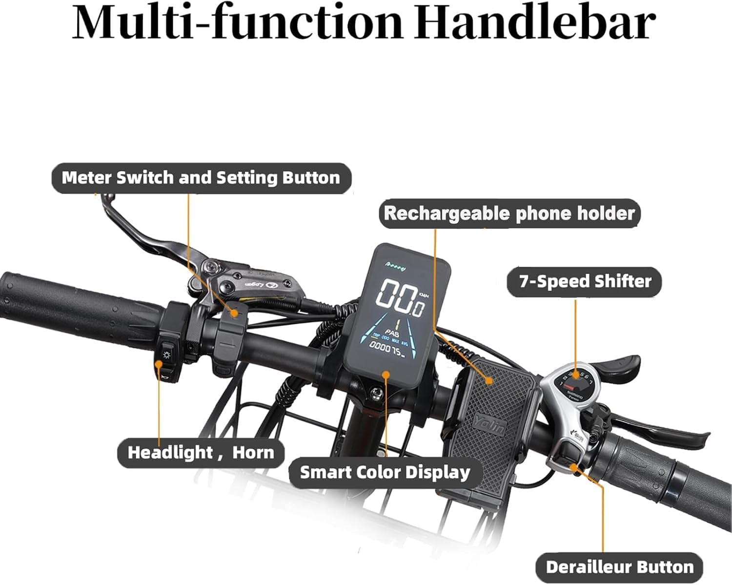 - Bürstenloser Hochgeschwindigkeitsmotor: Das Fat Tire Bike ist mit einem 48-V-Motor ausgestattet, der schnell, geräuscharm und leistungsstark ist. Es kann leicht helfen, 30-Grad-Hänge zu erklimmen.Die Höchstgeschwindigkeit kann auf 25 km/h begrenzt werden. Natürlich können Sie die Geschwindigkeit auch schneller anpassen, wenn Sie reisen möchten. Alles ist für Ihre Bequemlichkeit!