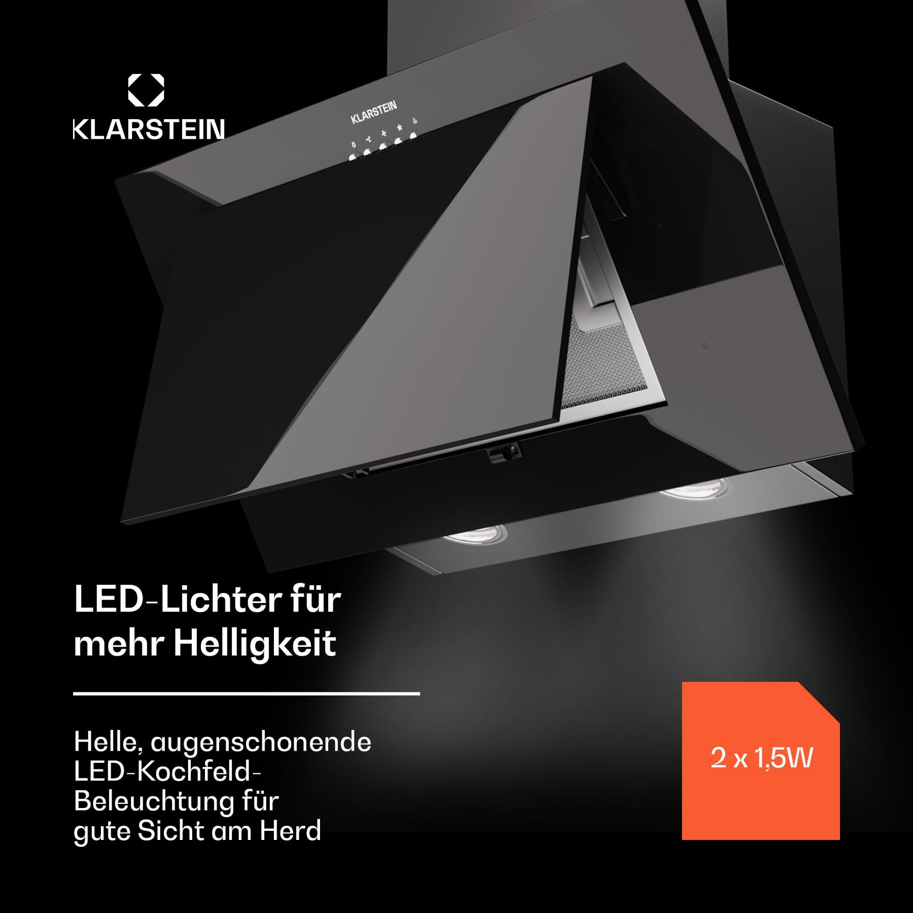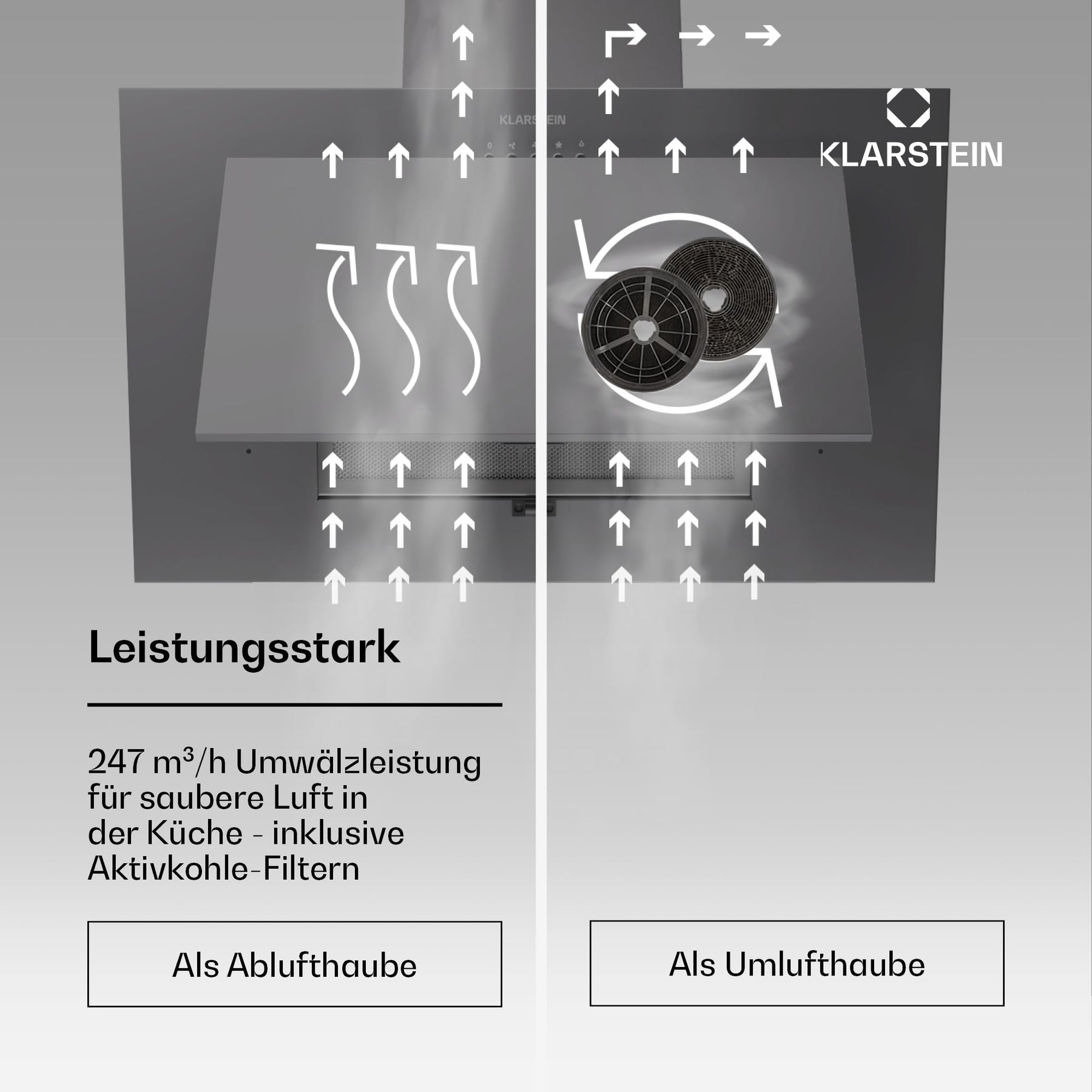 Einzelheiten: Klarstein Athena Dunstabzugshaube 60cm, Abluft/Umluft Dunstabzugshaube mit Spülmaschinenfestem Filter, Energieeffizienz A++, LED-Beleuchtung, Leise Abzugshaube mit 305m³/h Luftstrom, Effiziente Wandhauben