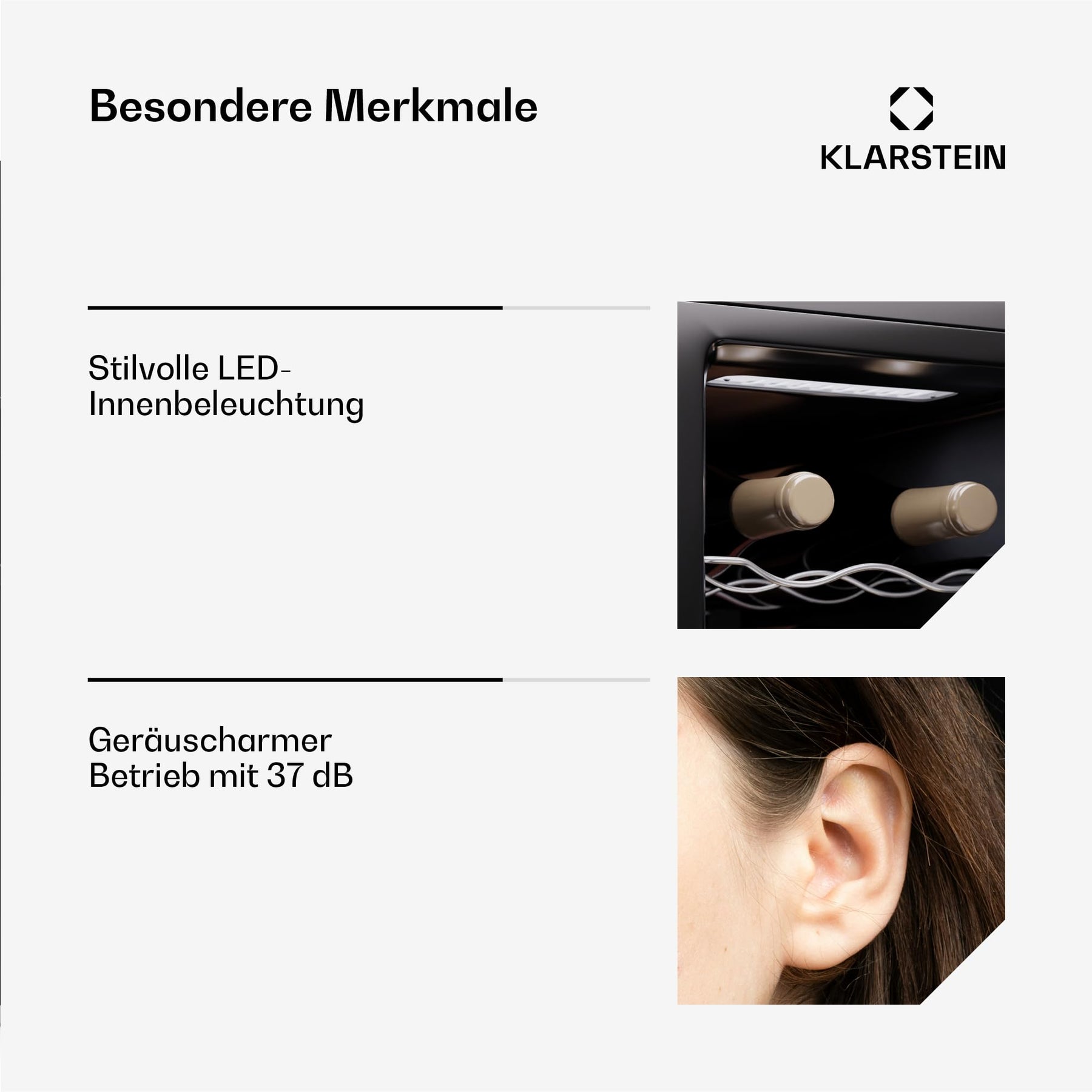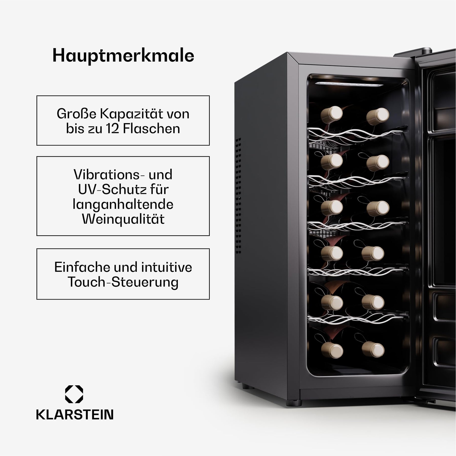Einzelheiten: Klarstein Vino Slim Freistehender Weinkühlschrank 1 Zone, Getränkekühlschrank Klein & Schmal, Kleiner Weinschrank, Wein-Kühlschrank Klein mit Glastür, Indoor/Outdoor Flaschenkühlschrank, Wine Fridge für 12 Flaschen