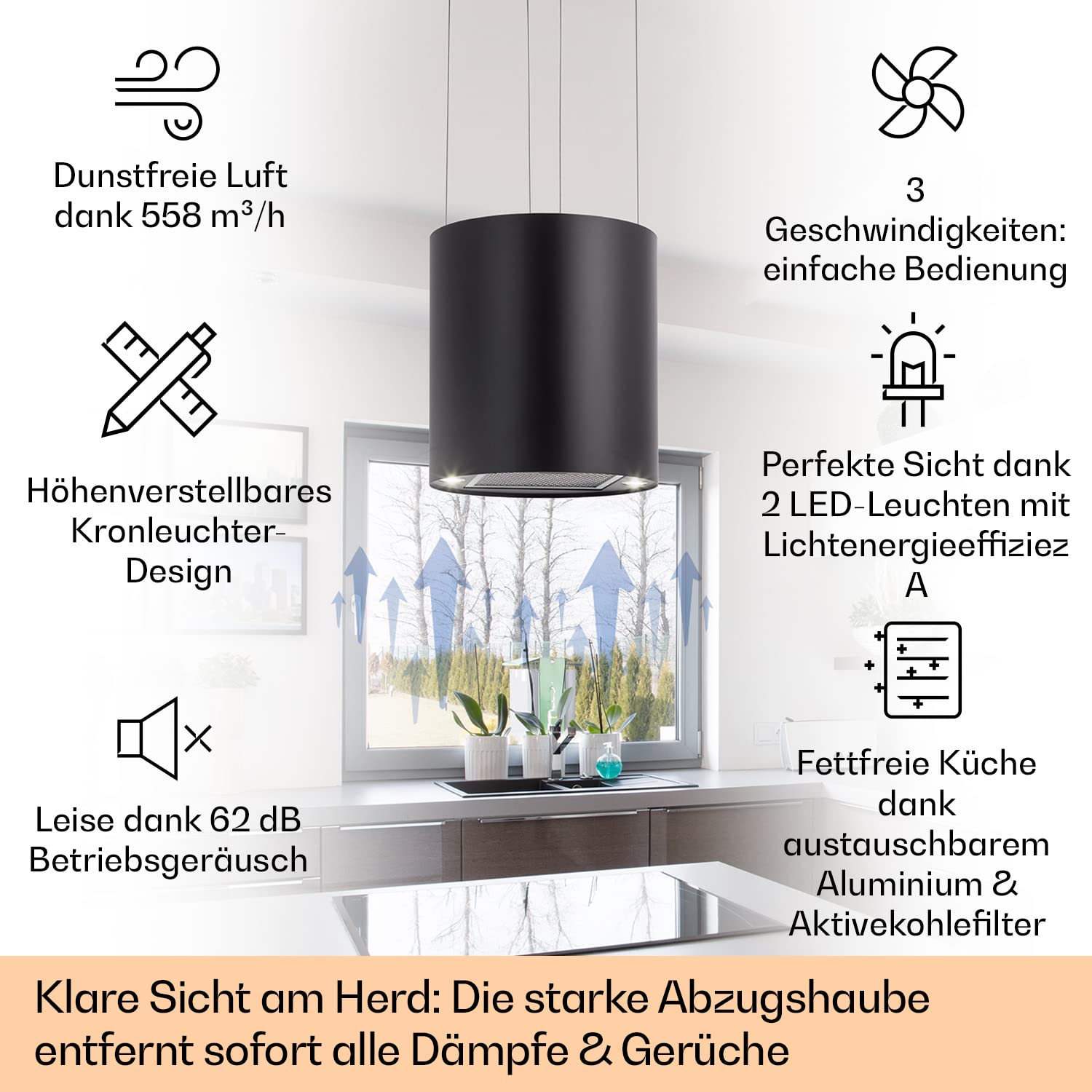 - MIT 3 STUFEN: Mit einem leistungsstarken Luftstrom von 558 m³/h und 3 Lüfterstufen filtert unser Dunstabzug freihängend Dämpfe und Gerüche für eine bessere Luftqualität. Der Auto-Off-Timer schaltet die Inselhaube aus, wenn sie nicht benutzt wird.