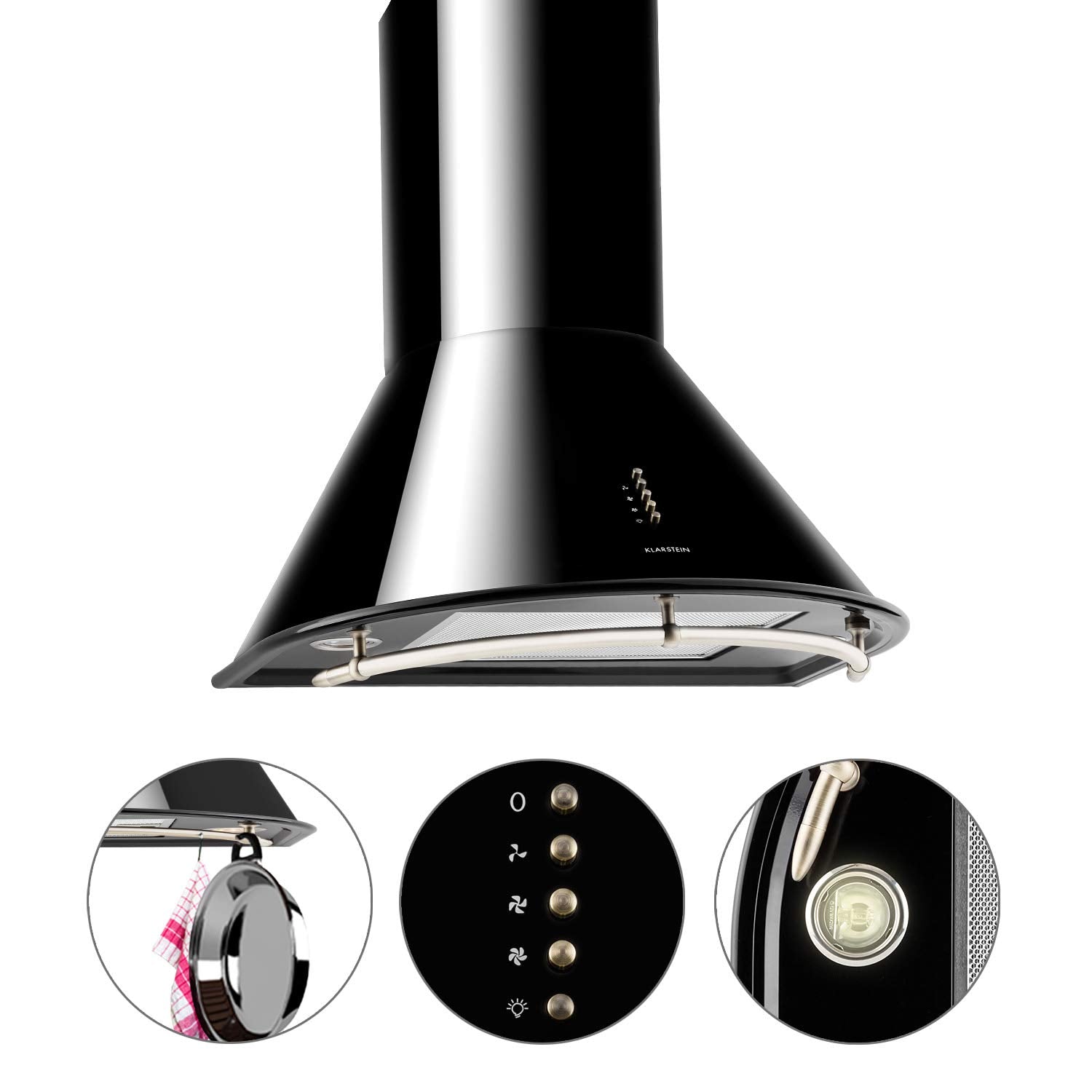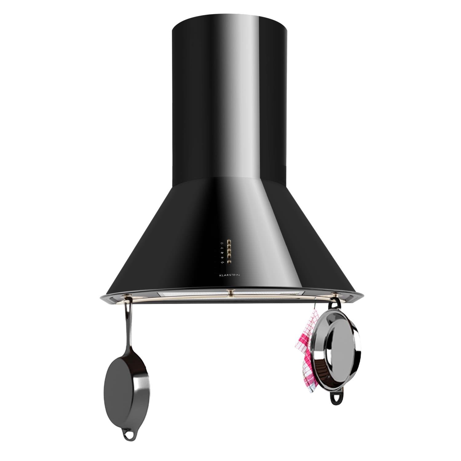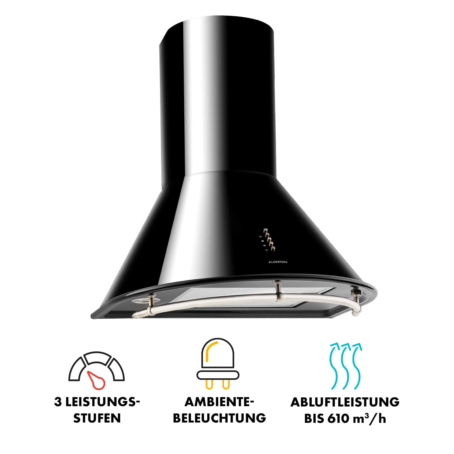• schwarz glänzende Dunstabzugshaube mit drei Leistungsstufen und 610 m 3 /h
