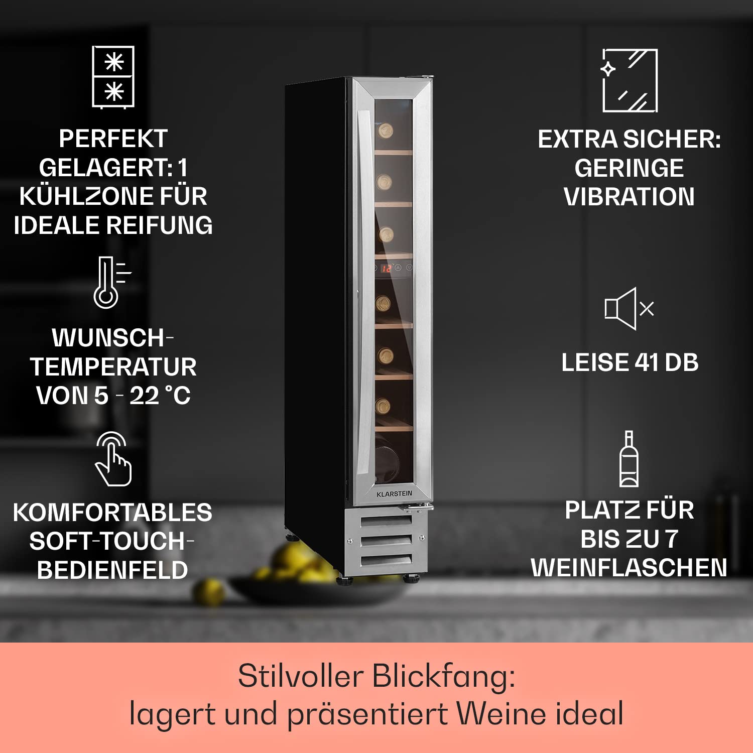Klarstein Weinkühlschrank, 1 Zonen Getränkekühlschrank, Kleiner Einbau-Weinschrank Schmal, 20L Wein-Kühlschrank mit Glastür, Indoor/Outdoor Flaschenkühlschrank, Wine Fridge 5-22°C, 7 Flaschen