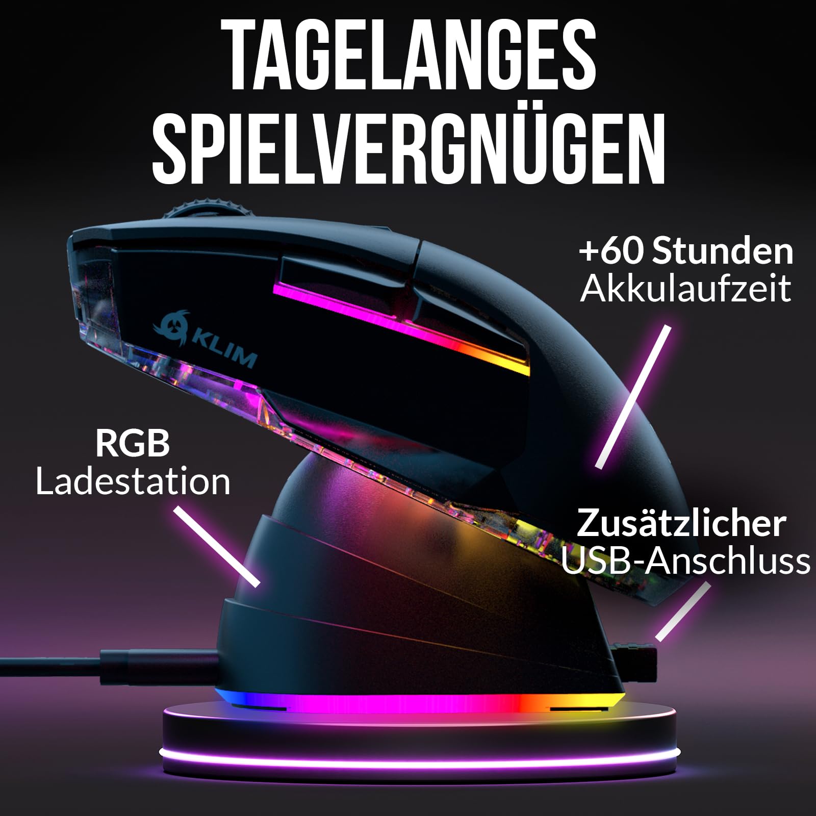 KLIM Blaze X RGB + NEU 2024 + Wiederaufladbare kabellose Gaming-Maus mit Ladestation + Langlebiger Akku + Bis zu 12000 DPI + Kabelgebundene & kabellose Maus PC, PS5, PS4, Mac + Schwarz
