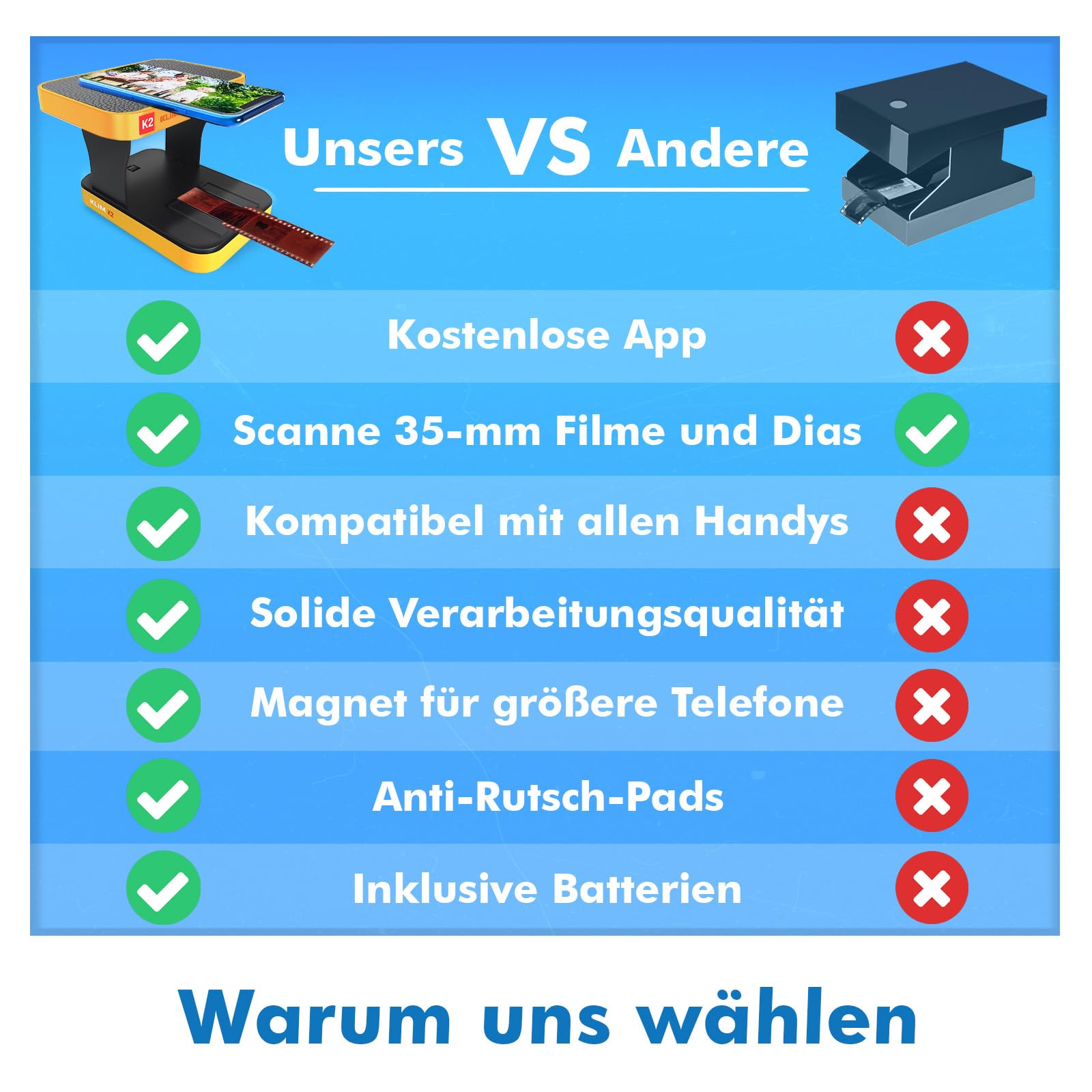 - FÜR ALLE DEINE ALTEN FOTOS. Der K2 Filmscanner bietet dir die kostengünstigste und einfachste Möglichkeit, deinen alten Film direkt auf dein Smartphone zu scannen. Der K2 Fotoscanner ist kompatibel mit 35-mm-Schwarzweiß-, Farbpostern, Negativen und Farbdias. Außerdem enthält das Paket Batterien, ein Reinigungstuch für deinen Film und einen Magneten für größere Telefone.