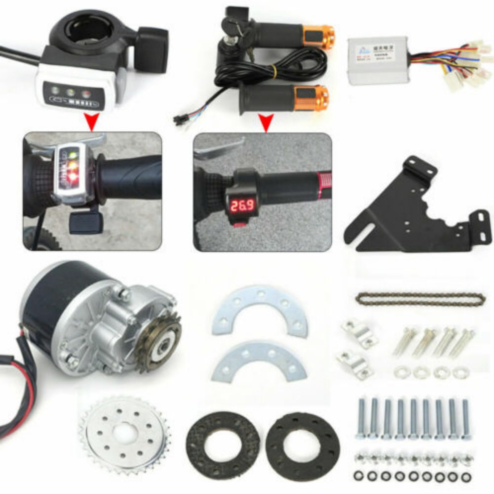 Dies ist unser neuestes Kit für Elektrofahrräder. Dieses Kit montiert das Kettenrad an den Radspeichen, sodass es für die meisten Fahrradräder geeignet ist.