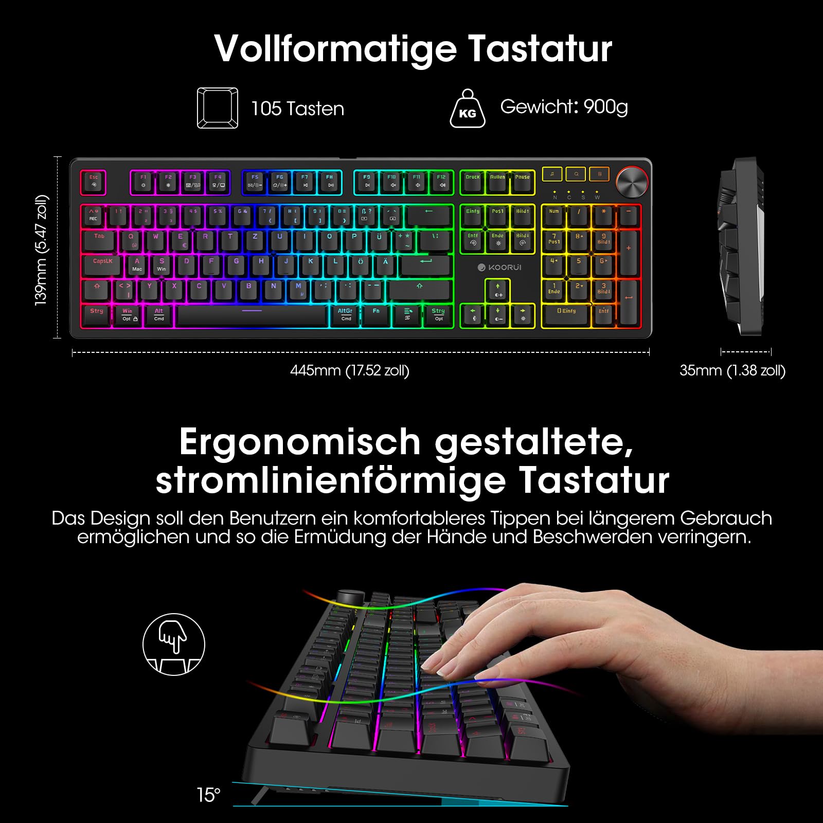 KOORUI Gaming Tastatur, Mechanisch Tastatur QWERTZ Deutsches Layout 104 Tasten 26 RGB Hinterleuchtet Kabelgebunden Gaming Keyboard für Windows MacOS Linux-Blauer Schalter