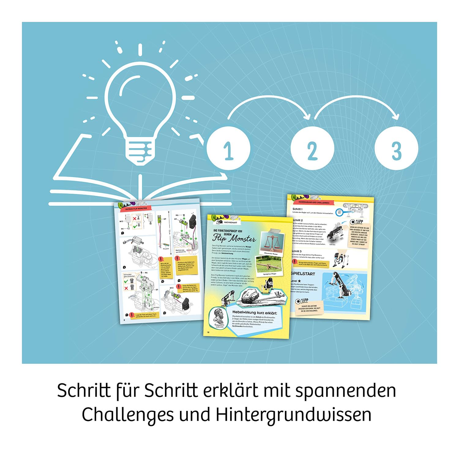 Per Handstand-Überschlag die Treppe hoch! Dieser Roboter flippt, erklimmt Treppen, klettert und überwindet Abgründe auf nie dagewesene Weise. Möglich machen es die Kraft der Hebelwirkung, die als innovativer Überschlagsantrieb genutzt wird. Es kann dadurch sogar selbständig wieder aufstehen, wenn es einmal zum Fall kommt! Der Aufbau ist dank großer Teile und weniger Schrauben schnell erfolgt. Im Nullkommanix können die passenden Batterien eingelegt werden und es geht los. Mit der besonderen Fortbewegungsart und dem innovativen Design ist das Flip-Monster der ideale Einstieg in die Welt der Roboter - mit hohem Spielwert und toller Action!