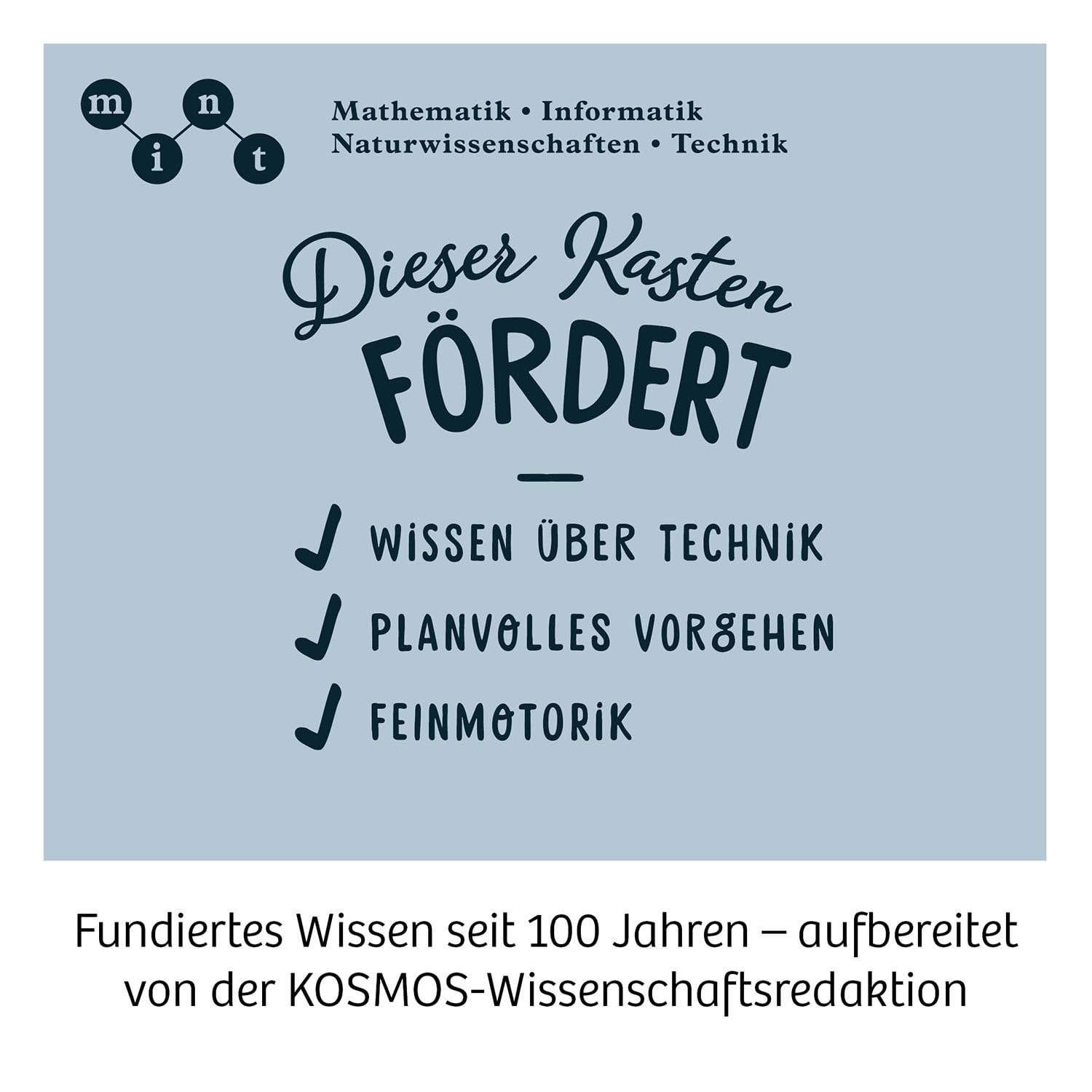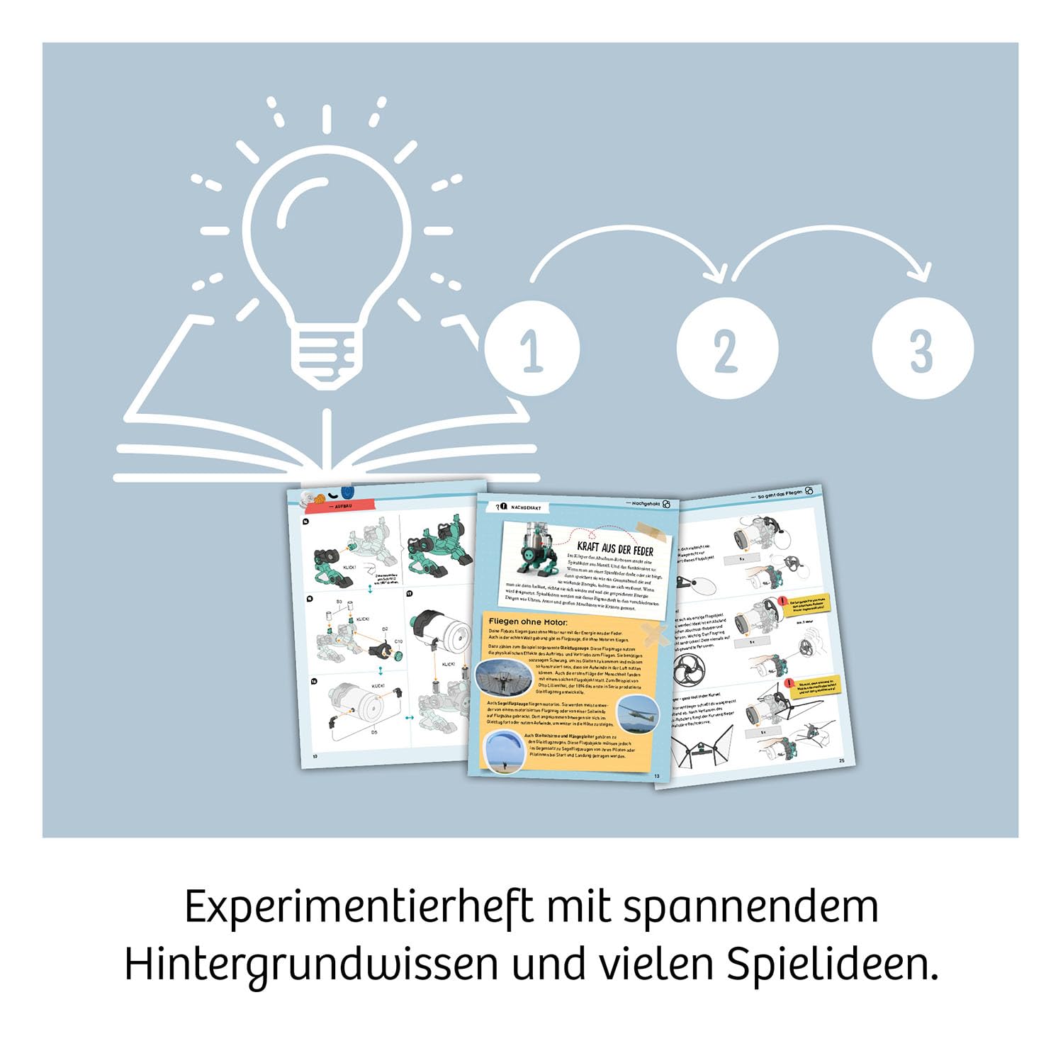 Ready for take-off! Die Flybots zusammenbauen, auf den Abschuss-Roboter setzten und bis zu 10 Meter in die Höhe katapultieren! Das Prinzip hinter diesem KOSMOS Experimentierkasten ist so einfach wie genial: Durch das Spannen einer Feder im Inneren des sogenannten Abschuss-Roboters wird mechanische Energie gespeichert und per Knopfdruck an die Flugobjekte abgegeben. Und schon flattern, kurven oder gleiten die Flybots durch die Luft – ganz individuell und abhängig von ihren unterschiedlichen Flügeln. So kann mit den verschiedenen Flugarten experimentiert und gespielt werden. Das Experimentierheft gibt dazu tolle Anregungen und erklärt Wissenswertes rund um den Feder-Antrieb und das Themen Fliegen.