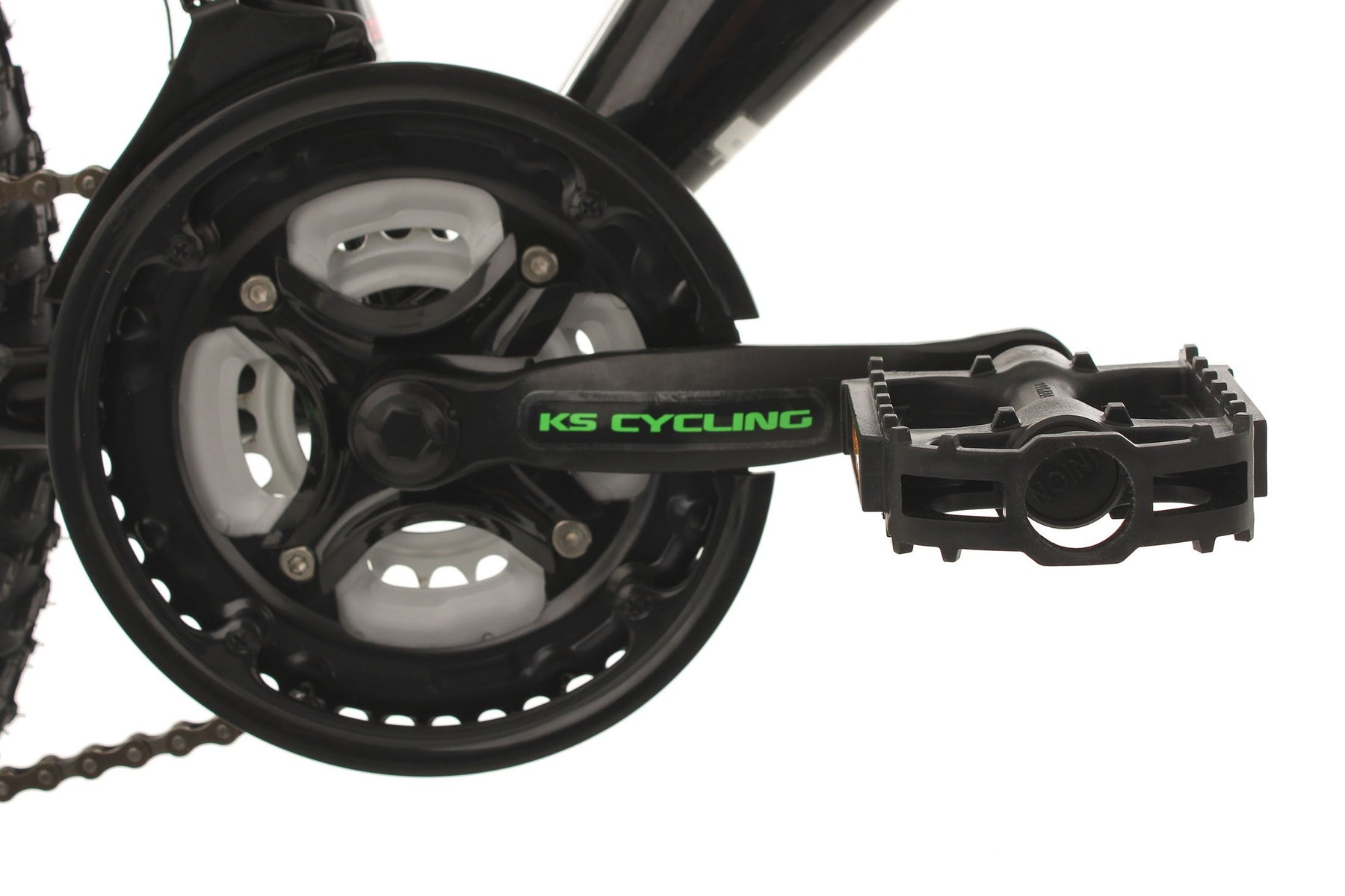 Einzelheiten: Cooler Look für coole Kids: Das 24" Jugend-Mountainbike BLISS von KS Cycling ist ein robustes Fully ganz im Design der "großen" Bikes. Der schwarze Rahmen mit seinen grünen Details ist komplett durchgestylt und zieht dabei alle Blicke auf sich. Aber auch die technische Ausstattung des Kinderfahrrads lässt keine Wünsche offen: Das vollgefederte Mountainbike ist mit Scheibenbremsen ausgestattet, eine SHIMANO 18-Gang-Schaltung rundet das Paket ab. So ist das BLISS der perfekte Einstieg ins Abenteuer Mountainbiking! Rahmen: Hi-Ten vollgefederter Stahlrahmen Rahmenhöhe: 38 cm Gabel: Federgabel mit 1" Ahead-Schaft Steuersatz: 1" Ahead-Steuersatz Vorbau: Stahl-Ahead-Vorbau Lenker: Stahl-Riserbar Naben: Stahlnabe vorne, Stahl-Schraubkranznabe hinten Reifen: Stollenreifen 24" x 1,95" (53-507) Felgen: Aluminiumfelgen mit Verschleißindikator Schaltungstyp: 18-Gang-Kettenschaltung Schaltwerk: SHIMANO Tourney Umwerfer: SHIMANO Schalthebel: SRAM Drehschaltgriff Ritzel: 6-Gang-Schraubkranz (28-12 Zähne) Kurbel: Stahlkurbeln (Kettenblätter 42-34-24 Zähne) Innenlager: BSA-Patronenlager Pedale: Kunststoffpedale Sattel: MTB-Sattel Sattelstütze: Stahl-Kerzensattelstütze Ø 25,4 mm Sattelklemmung: Klemmring mit Schnellspanner Bremse: CLARKS mechanische Scheibenbremsen Bremshebel: Komposit Zubehör: Schutzbleche Gewicht: ca. 16 kg
