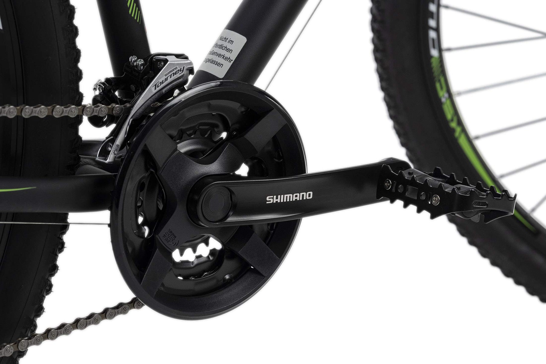Einzelheiten: "Rahmen: Aluminium-Hardtail-Rahmen Rahmenhöhe: 46 cm Farbe: Schwarz Gabel: Federgabel mit Ahead-Schaft 1 1/8"" Steuersatz: Ahead-Steuersatz Vorbau: Aluminium-Ahead-Vorbau Lenker: Stahl-MTB-Lenker Naben: Vollachsnaben mit Bremsscheibenaufnahme Felgen: Aluminium-Hohlkammerfelgen Reifen: Stollenreifen 29"" x 2,10"" (54-559) Gänge: 24-Gang-Kettenschaltung Schaltwerk: SHIMANO Acera Umwerfer: SHIMANO Tourney 3-fach-Umwerfer Schalthebel: SHIMANO ST-EF500 Ritzel: SHIMANO CS-HG31 8-Gang-Kassette (Abstufung 30-11 Zähne) Kurbel: SHIMANO Tourney FC-TY301 Aluminium-Kurbeln (Kettenblätter 42-34-24 Zähne) Innenlager: BSA-Patronenlager Pedale: Kunststoffpedale mit Stahlkäfig Gepäckträger: - Schutzbleche: - Sattel: MTB-Sattel Sattelstütze: Aluminium-Patentsattelstütze Ø 27,2 mm Sattelklemmung: Klemmring mit Schraube Bremse: Mechanische Scheibenbremsen (mit Wave-Bremsscheiben Ø 160 mm) Bremshebel: SHIMANO ST-EF51 Scheinwerfer: - Rücklicht: - Dynamo: - Ständer: - Zubehör: Klingel Gewicht: ca. 14,5 kg"