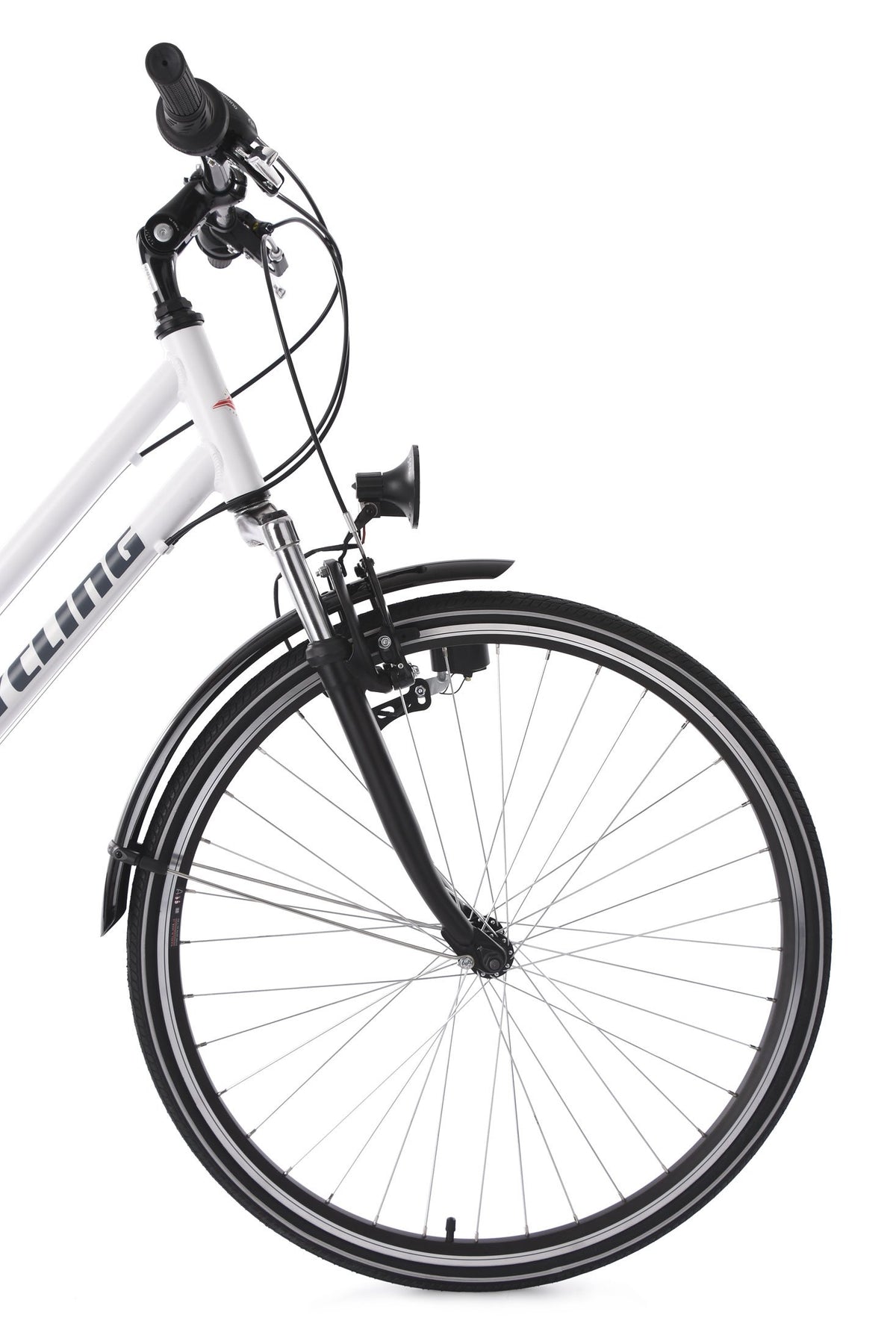 Einzelheiten: Nicht nur für die Großstadt perfekt ausgestattet: Das 28" Trekking-Damenfahrrad METROPOLIS von KS Cycling bringt Sie auf jeder Strecke sicher ans Ziel. Das Fahrrad hat einen weißen Rahmen mit eleganten grauen Details. Der transparente Kettenschutz rundet das Design ab. Mit der SHIMANO Kettenschaltung mit 21 Gängen sind Steigungen kein Problem mehr. Dank der Federgabel sind kleine Unebenheiten auf der Strecke fast nicht mehr zu spüren. Auf dem Gepäckträger bringen Sie Ihr Gepäck auch für längere Touren unter. Selbstverständlich ist das Fahrrad zudem mit einer Beleuchtungsanlage gemäß StVZO ausgerüstet. So können Sie sich jederzeit auf Ihren neuen Begleiter verlassen. Rahmen: Aluminium-Rahmen Rahmenhöhe: 48 cm Farbe: Weiß Gabel: Federgabel (Federweg 30 mm) mit 1 1/8" Gewindeschaft Steuersatz: 1 1/8" Gewindesteuersatz für Gewindegabeln Vorbau: 1 1/8" verstellbarer Aluminium-Schaftvorbau Lenker: Stahl-Riserbar Naben: Stahlnabe vorne, Stahl-Schraubkranznabe hinten Felgen: Aluminium-Hohlkammerfelgen Reifen: Trekkingreifen mit Reflexstreifen 700x35c (37-622) Gänge: 21 Gänge Schaltwerk: SHIMANO Tourney Umwerfer: SHIMANO Schalthebel: SHIMANO RevoShift Drehschaltgriffe Ritzel: SHIMANO MF-TZ21 Schraubkranz Kurbel: Stahl-Kurbeln mit 3 Kettenblättern (Abstufung 28-38-48 Zähne) Innenlager: Patronenlager BSA 68 Pedale: Kunststoff-Pedale Gepäckträger: Stahl mit Federklappe (25 kg Zuladung max.) Schutzbleche: bruchsicherer Kunststoff Sattel: Trekkingsattel Sattelstütze: Stahl-Kerzensattelstütze Ø 27,2 mm Sattelklemmung: Klemmring mit Schraube Bremse: Aluminium-V-Brakes Bremshebel: Aluminium/Komposit Scheinwerfer: Halogenscheinwerfer Rücklicht: Gepäckträgerrücklicht (baterriebetrieben) Dynamo: Seitenläufer-Dynamo Ständer: -- Zubehör: Kettenschutz, Klingel Gewicht: ca. 16,7 kg