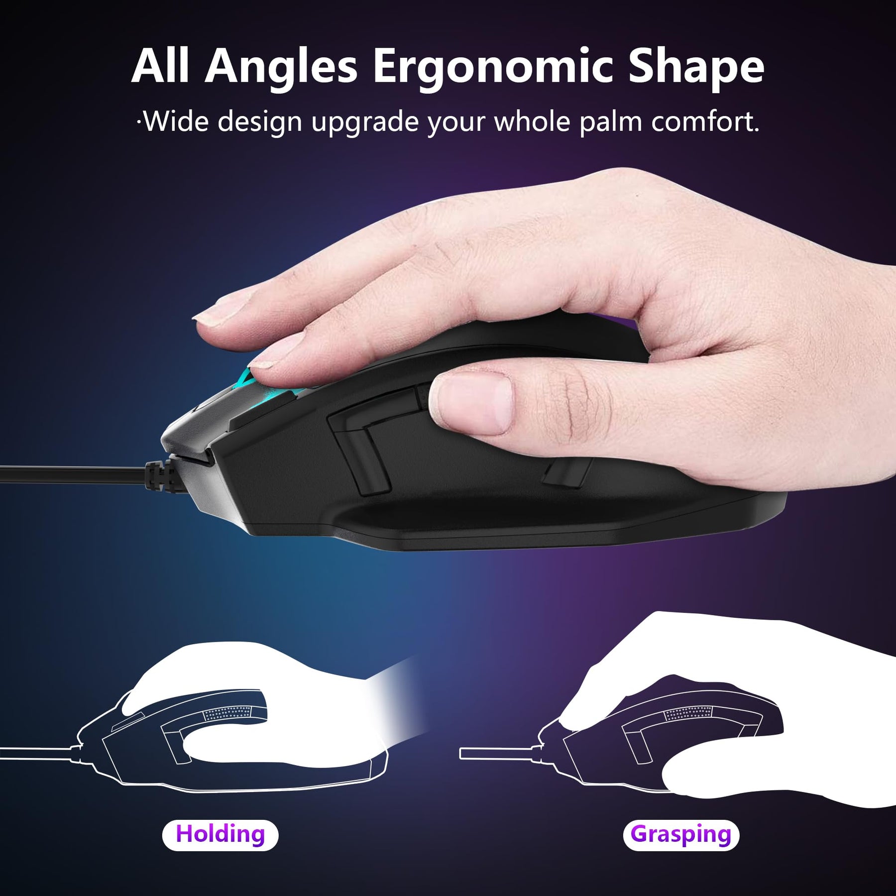 - 6 Tasten & RGB-Hintergrundbeleuchtung: Unsere kabelgebundene Gaming-Maus verfügt über 6 programmierbare Tasten und 7 RGB-Beleuchtungszonen für anpassbare Lichteffekte. Genießen Sie den Glanz der kabelgebundenen Gaming-Maus, indem Sie jede Zone aus über 16,8 Millionen Farben und unzähligen Lichteffekten anpassen. (Die LED-Hintergrundbeleuchtung kann auch deaktiviert werden)