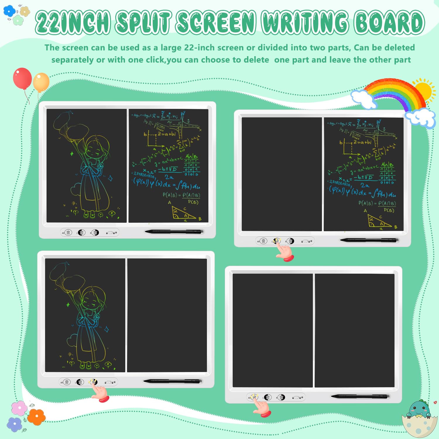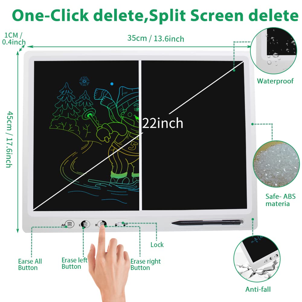 - Neues Upgrade: Kinder LCD Schreibtablett 22" Neben der Möglichkeit, auf einem geteilten Bildschirm zu schreiben und zu löschen, unterstützt es auch die sperrung des gesamten bildschirminhalts, um versehentliches löschen zu verhindern. Der bildschirm besteht aus hochwertigen materialien und ist 60 % heller. Der klarere, größere LCD-Bildschirm bietet viel zusätzlichen platz, um mehr Inhalte zu zeichnen und so ein besseres zeichen- und schreiberlebnis zu ermöglichen