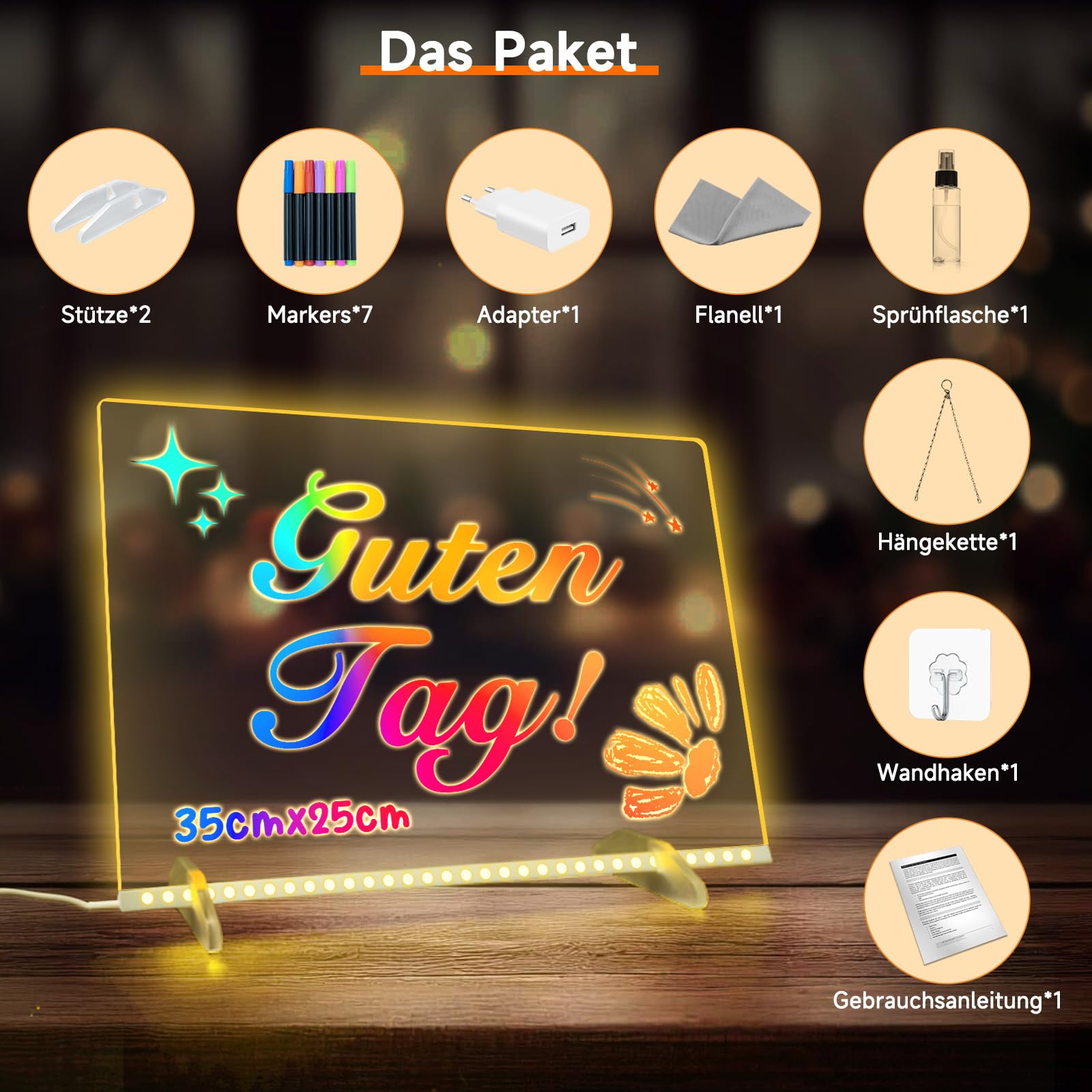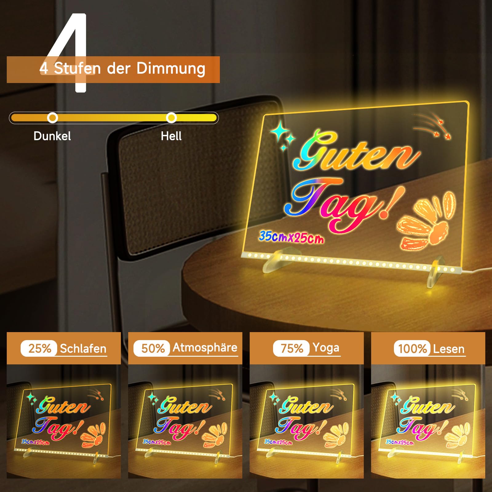 - 2025 Aufgerüstetes LED-Zeichenbrett: LED-Notiztafel mit Farben besteht aus hochwertigem, kratzfestem Acryl, das beim Abwischen nicht so leicht zerkratzt, reibungslos schreibt und leicht zu löschen ist.Die perfekte Größe von 35x25cm bietet viel Platz für Kreativität. Eingebaute 20 LED-Lichtperlen und die hochtransparente Oberfläche ermöglichen es, dass die Zeichnung die besten Lichteffekte zeigt.