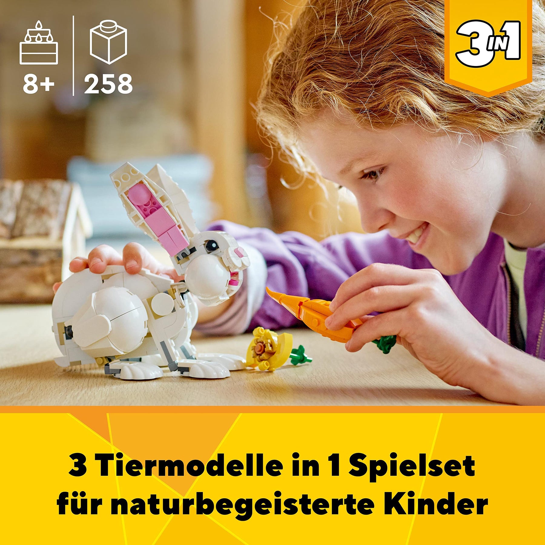 Kinder ab 8 Jahren können mit diesem fantastischen LEGO Creator 3in1 Tier-Set Weißer Hase (31133) lustige Geschichten nachspielen. Kleine Tierliebhaber werden es lieben, mit 3 verschiedenen LEGO Tierfiguren, die in diesem Spielset zur Auswahl stehen, lustige Geschichten zu erfinden. Mit den 3 Bau-und-Spiel Erlebnissen in Form von Tierfiguren können Kinder mit einem supersüßen LEGO Spielzeughäschen durch einen Wald hüpfen und eine Karotte oder eine Blume mampfen. Später können sie das LEGO Kaninchen in einem Spielzeug-Papagei umbauen und hoch oben in die Bäume setzen, oder sie verändern ihn wieder und tauchen ab ins Meer, um neben einer weißen LEGO Robbe zu schwimmen, die gerade einen Fisch als Snack genießt! Mit der LEGO Builder App kann das Modell gezoomt, gedreht und visualisiert werden. Der angeleitete Bauprozess hilft den kleinen Baumeistern, ihre Tierspielzeug auf ihrem Tablet oder Smartphone zum Leben zu erwecken und gibt ihnen garantiert ein Erfolgserlebnis. Mit den LEGO Creator 3in1 Sets können Kinder stundenlang fantasievoll spielen, während sie die 3 verschiedenen Modelle in jeder Box in LEGO Tiere verwandeln. Dieses LEGO Tier-Set ist ein spannendes Konstruktionsspielzeug für Kinder ab 8 Jahren und ist die perfekte Belohnung für enthusiastische LEGO Fans und eine tolle Geschenkidee zum Geburtstag. Der Spielzeughase ist über 15 cm hoch. Enthält 258 Teile.