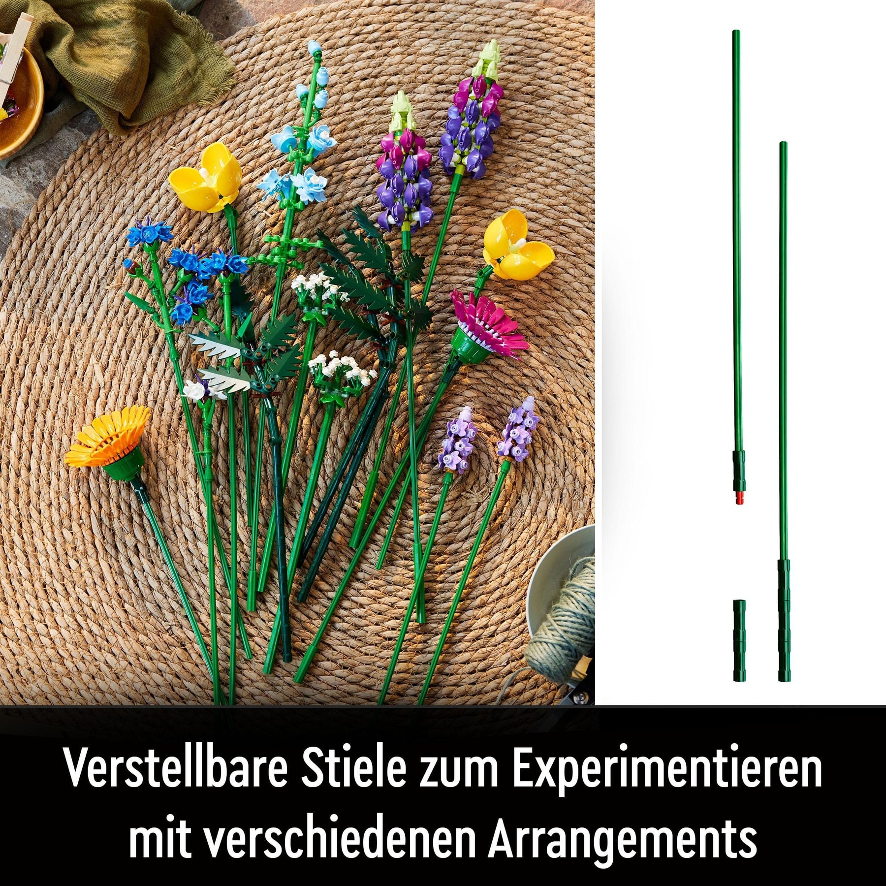 Das LEGO Botanicals Wildblumenstrauß Set (10313) aus der Botanical Collection gibt dir die Möglichkeit, deiner Kreativität freien Lauf zu lassen. Mit 8 verschiedenen Blumensorten, die alle sorgfältig aus LEGO Teilen zusammengebaut werden, wird dieser Strauß sicher beeindrucken. Du kannst ihn ganz nach deinem Geschmack gestalten - kombiniere Farben, Formen und Größen für einen einzigartigen Look. Der Wildblumenstrauß ist ein stilvoll gestaltetes Kunstwerk, das komplett aus LEGO Steinen besteht. Sein farbenfrohes Design zeigt 8 verschiedene Arten von Wildblumen auf verstellbaren Stielen, die Kornblumen, Lavendel, Klatschmohn, Kuhsilie, Lederfarn, Gerbera, Rittersporn und Lupinen zum Leben erwecken. Das praktische Bauerlebnis in Kombination mit der Möglichkeit, jede Blume im Set zu identifizieren, macht es zu einer spannenden Aktivität für angehende Floristen und Blumenliebhaber. Dieses einzigartige LEGO Set für Erwachsene ist die perfekte Möglichkeit, deine innere Kreativität zu entfalten. Mit zahlreichen Elementen aus pflanzlichem Kunststoff, der aus nachhaltig angebautem Zuckerrohr hergestellt wurde, ist diese Sammlung künstlicher Blumen und Pflanzen ein echter Hingucker in jedem Zuhause. Egal, ob du ein Blumenliebhaber bist oder einfach nur schöne Heimdeko magst, dieses Blumen Geschenk zum Basteln für Erwachsene wird sicherlich viel Freude bereiten. Der 'Rittersporn' mit seinem geraden Stiel ist über 47 cm hoch. Enthält 939 Teile.