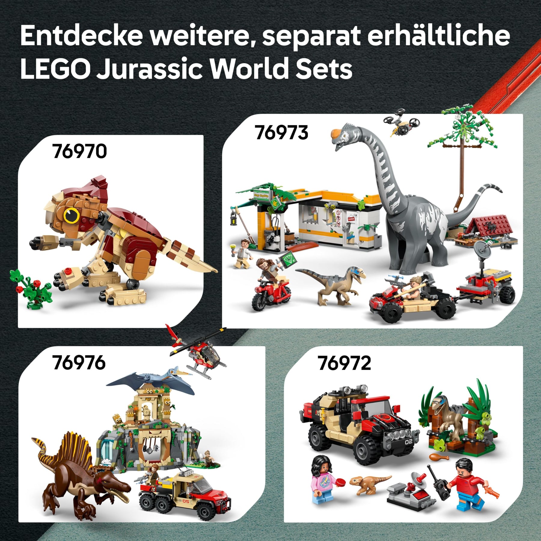 Mit diesem detailreichen LEGO Jurassic World Bauset können Kinder und Fans ab 5 Jahren eine spannende Filmszene aus Jurassic World Rebirth nachspielen oder eigene Dino-Abenteuer darstellen. Flucht vor dem T.Rex (76975) ist ein leicht zu bauendes LEGO Spielset und ein tolles Geschenk für Jungen und Mädchen ab 5 Jahren. Das Set beinhaltet einen gegossenen T.Rex, der Arme, Beine, Schwanz, Kopf und Maul bewegen kann. Auch die beiden Minifiguren Teresa Delgado und Xavier Dobbs laden zum Spielen ein. Es gibt auch einen Schuppen, der zerstört werden kann, ein Bootkatapult, ein Boot und ein Quad für viele spannende Abenteuer. Die LEGO Builder App nimmt Kinder auf ein intuitives Bauabenteuer mit. In der App können sie 3D-Ansichten der Modelle vergrößern und drehen, Baumodelle speichern und den Baufortschritt verfolgen. Dieses Bau- und Spielset ist ein tolles Geburtstags- oder Weihnachtsgeschenk, das jüngere Kinder, die Abenteuer und Dinosaurier lieben, mit großer Begeisterung ins Jurassic World Universum eintauchen lässt. Für noch mehr Spielspaß lassen sich diese Dinosaurier Figuren und Modelle auch mit anderen separat erhältlichen LEGO Jurassic World Sets kombinieren. Das Spielset besteht aus 199 Teilen. Mit dem angebauten Steg und dem Boot ist der Schuppen 8 cm hoch, 20 cm breit und 14 cm tief Enthält 199 Teile