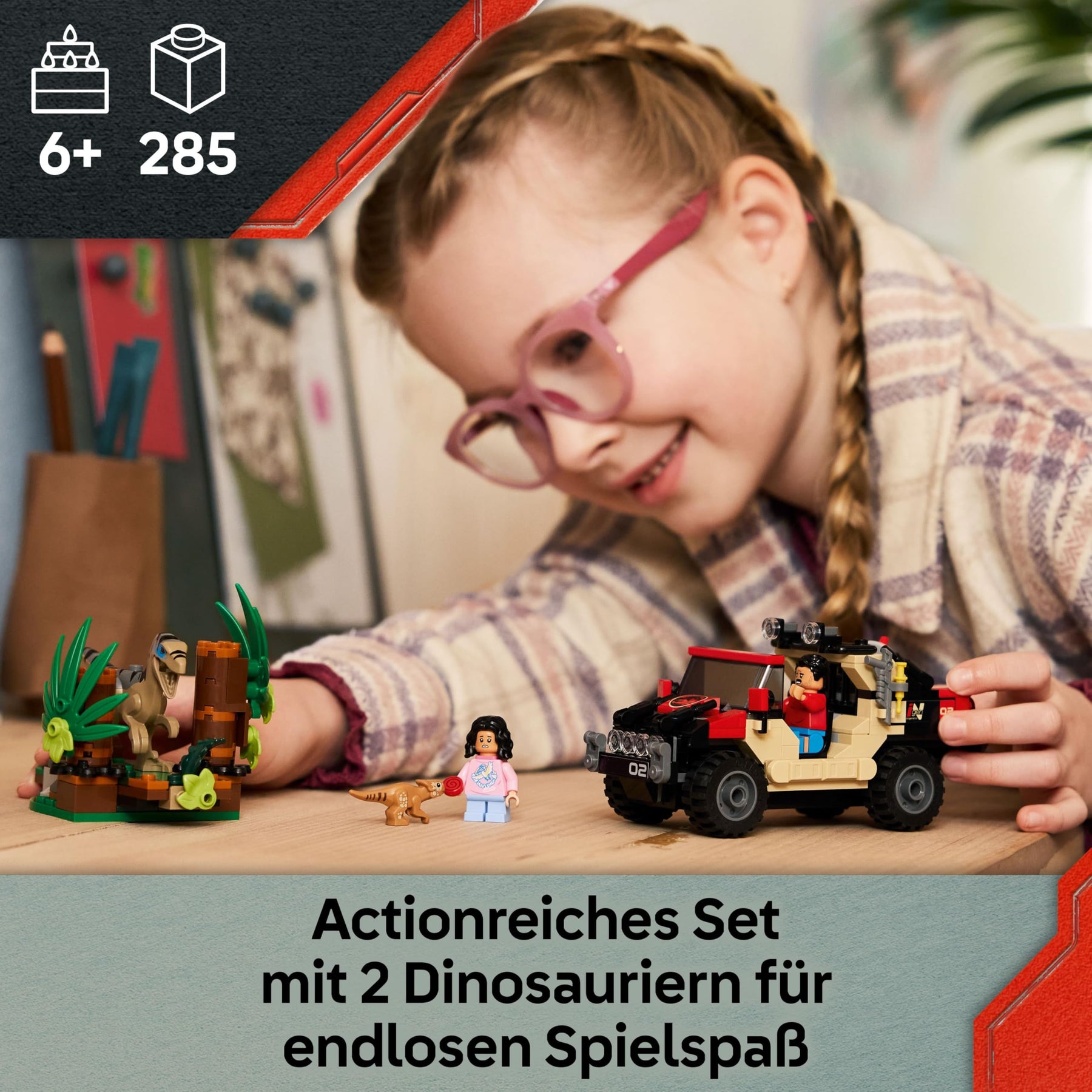 LEGO Jurassic World Raptor: Verfolgungsjagd mit dem Geländewagen (76972) ist ein actionreiches Dinosaurier-Spielzeug, das Kinder ab 6 Jahren begeistert. Das Spielset basiert auf dem Film Jurassic World Wiedergeburt und bietet viele spannende Spielmöglichkeiten rund um Dinos, Fahrzeuge und Minifiguren. Mit 285 Teilen enthält das LEGO Bauset einen Velociraptor mit aufklappbarem Maul, die Dinosaurier-Figur Baby Dolores, die Minifiguren Reuben und Isabella Delgado, einen baubaren Geländewagen mit Aufspürgerät sowie einen Busch mit drückbarer Schreck-Funktion, ein tolles Detail für noch mehr Action beim Spielen. Ob beim Nachspielen von Filmszenen oder beim Erfinden eigener Geschichten: Dieses Dino Spielzeug fördert die Fantasie und ist mit anderen LEGO Jurassic World Bausets kombinierbar. Die robuste Bauweise und die beweglichen Elemente machen es zu einem spannenden Bau-Spielzeug für Dino-Fans. Mit der LEGO Builder App wird der Aufbau zum Erlebnis , Kinder können Baukästen digital in 3D betrachten, drehen, speichern und ihren Fortschritt verfolgen. Dieses Baumodell eignet sich hervorragend als Spielzeug Jungen ab 7 Jahren oder Mädchen und natürlich für alle, die Jurassic World Figuren lieben. Der Geländewagen ist 7 cm hoch, 15 cm lang und 6 cm breit Enthält 285 Teile