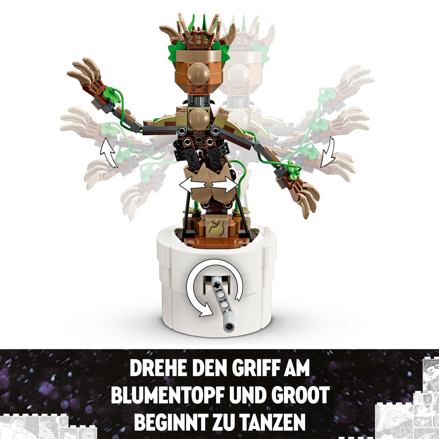 LEGO Marvel Tanzender Groot (76297) ist ein Guardians of the Galaxy Bauspielzeug mit interaktiver Tanzfunktion. Das Set ist ein tolles Geschenk für Kinder ab 10 Jahren, die den Marvel Charakter Groot, Superhelden und LEGO Abenteuer-Sets lieben. Die Groot-Figur Groot zum Bauen und Spielen kann seinen Kopf und seine Arme bewegen. Wenn Kinder den Griff auf der Rückseite des Blumentopfes drehen, beginnt der gelenkige Groot zu tanzen. Man kann die Figur zusätzlich mit Blättern, einem baubaren Kopfhörer und einer Sonnenbrille aufpeppen. Kinder können dem Blumentopf ihre ganz persönliche Note verleihen, indem sie 1 von 3 Namensschildern vorne am Topf befestigen. Eines davon bezieht sich auf die TV-Serie Ich bin Groot. All diese Zubehör-Elemente lassen sich in einem Fach im Blumentopf verstauen. Mit der LEGO Builder App macht das Bauen sogar noch mehr Spaß, denn in der App können Kinder 3D-Ansichten des Modells vergrößern und drehen und ihren Baufortschritt verfolgen. Das fertige Modell ist 22 cm hoch. Enthält 459 Teile.