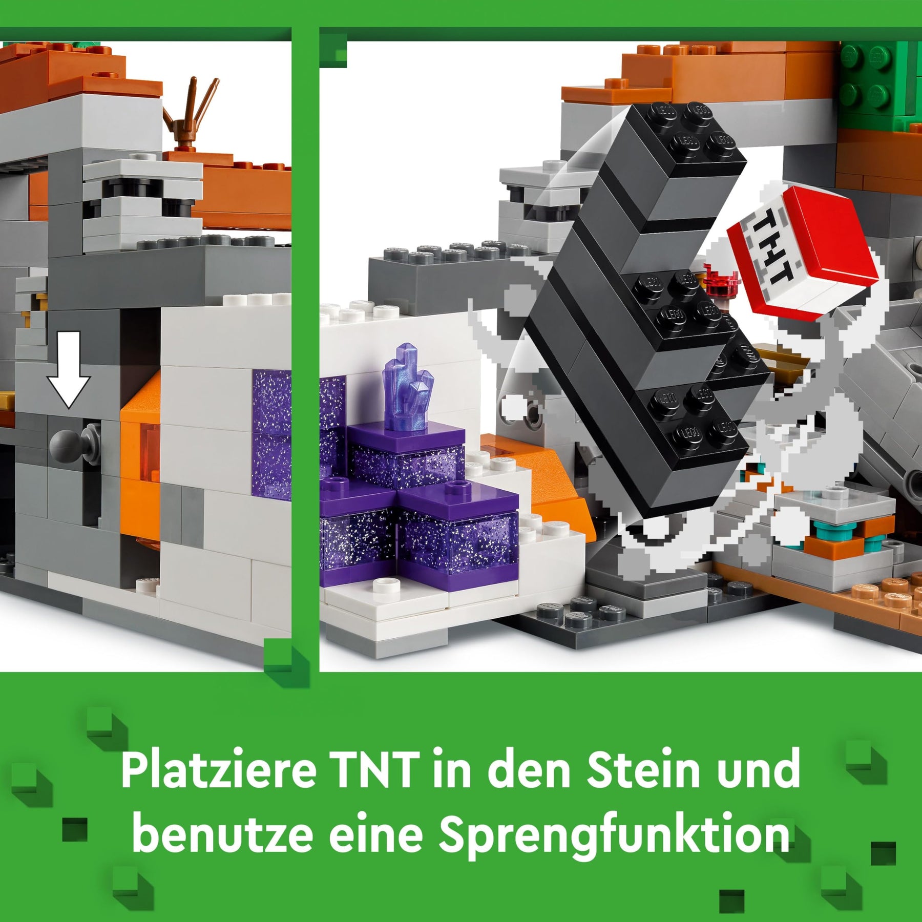 - Kreativer Modellbau mit Minifiguren: Kinder können mit der Hand eine Sprengung auslösen, um Kupfer, Gold, Redstone und Amethysten freizulegen; eine schöne DIY Freizeitbeschäftigung