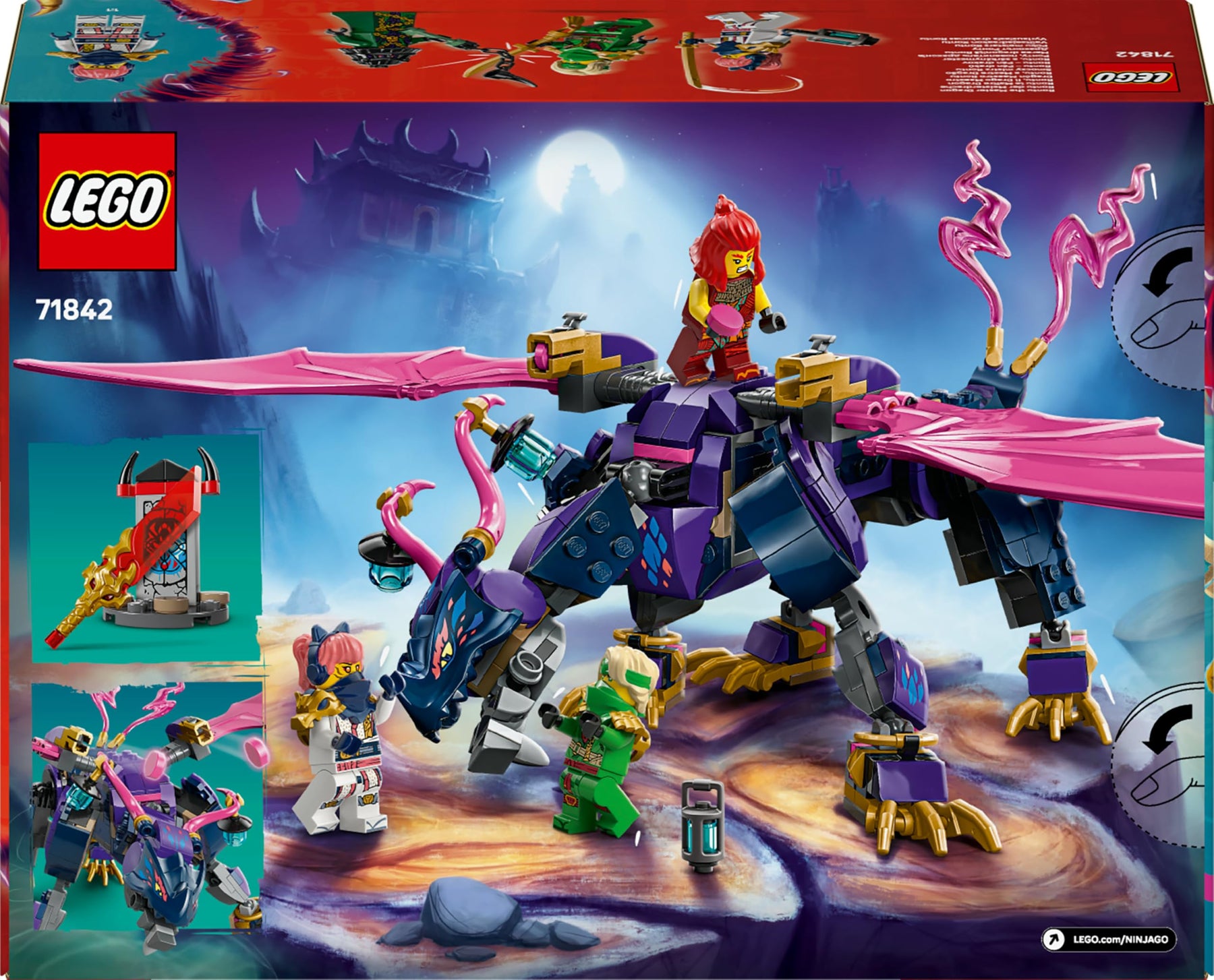 LEGO NINJAGO Rontu der Meisterdrache (71842) ist ein Spielset, das Ninja-Fans die Actionszenen aus der 3. Staffel der TV-Serie NINJAGO Aufstieg der Drachen nachstellen lässt. Dieses Bauset für Kinder beinhaltet einen Spielzeugdrachen, der Schwanz, Beine, Flügel, Kopf und Maul bewegen kann und Shooter unter jedem Flügel hat. Auf seinem Rücken gibt es 2 Positionen, um eine Minifigur zu platzieren. 4 NINJAGO Minifiguren gehören zu diesem LEGO Spielset. Die Ninja Lloyd, Sora und Wyldfyre mit Ninja-Ausrüstung sowie Zarkt, der Meister des Unglücks, lassen Kinder viele Duelle zwischen Gut und Böse darstellen. Ein Mini-Modell eines Schreins aus LEGO Steinen verbirgt eine geheime Botschaft, die Lloyd mit seiner durchscheinenden Enthüllungsklinge aufdeckt. In dem breiten Angebot an separat erhältlichen LEGO NINJAGO Bausets und baubaren Action-Spielzeugen finden Ninja-Fans viele Mechs, Fahrzeuge und Tempel für spannende Rollenspiele und Ninja-Abenteuer. Jedes dieser Ninja-Spielsets kann auch mithilfe der LEGO Builder App gebaut werden, die dich und dein Kind auf ein ebenso einfaches wie intuitives Bauabenteuer mitnimmt. Rontu der Meisterdrache ist 13 cm groß. Enthält 381 Teile.