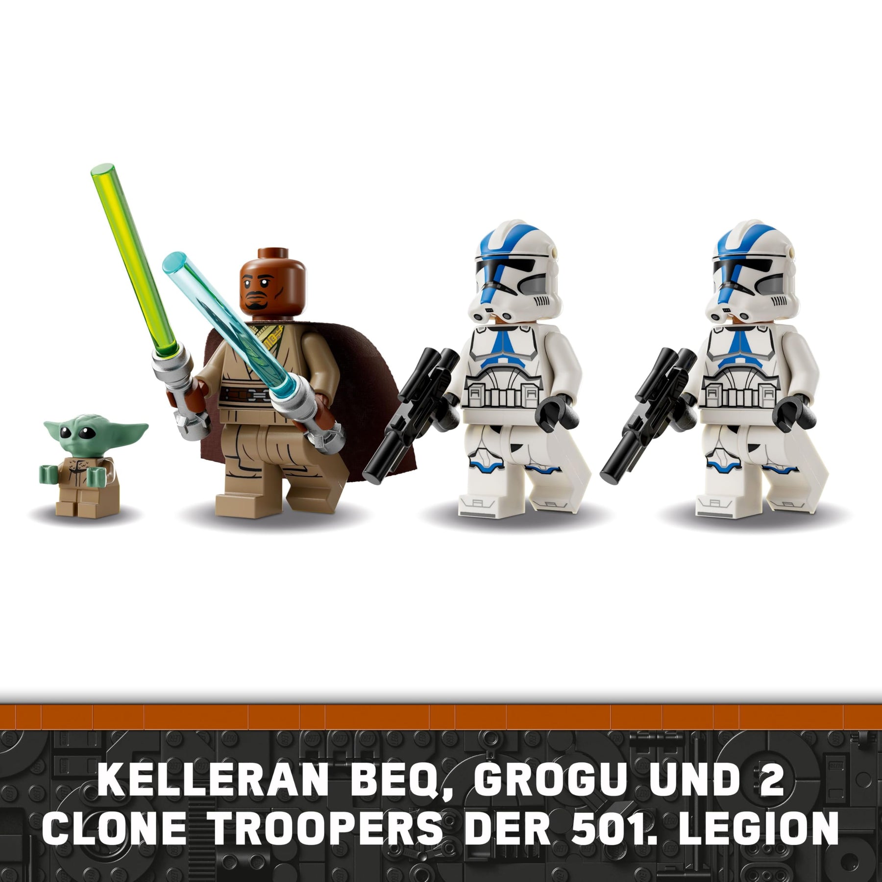 - 3 LEGO Star Wars Minifiguren und Grogu: Kelleran Beq mit blauem und grünem Lichtschwert, die beiden Clone Troopers der 501. Legion mit Blastern sowie die LEGO Figur Grogu bzw. Baby Yoda