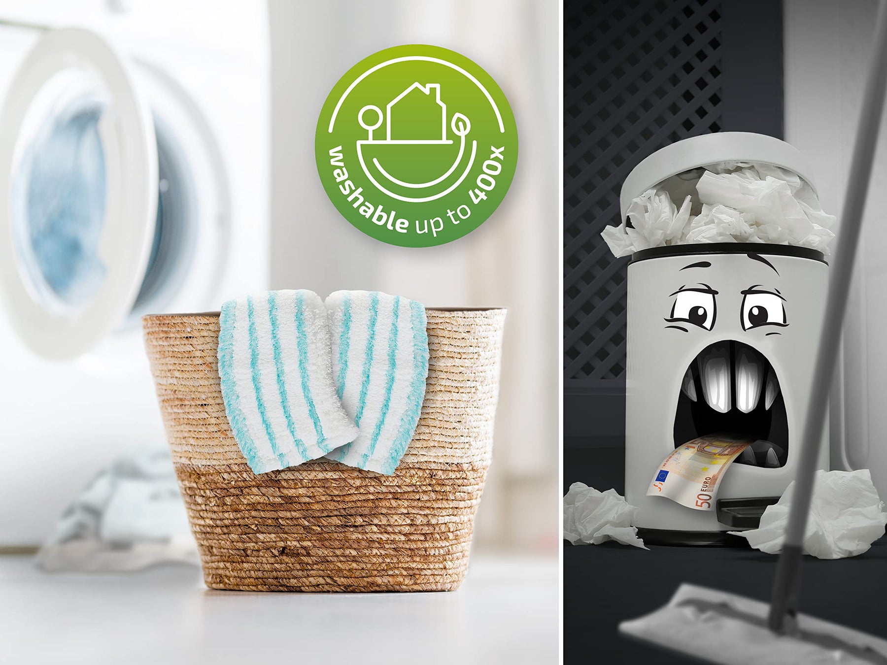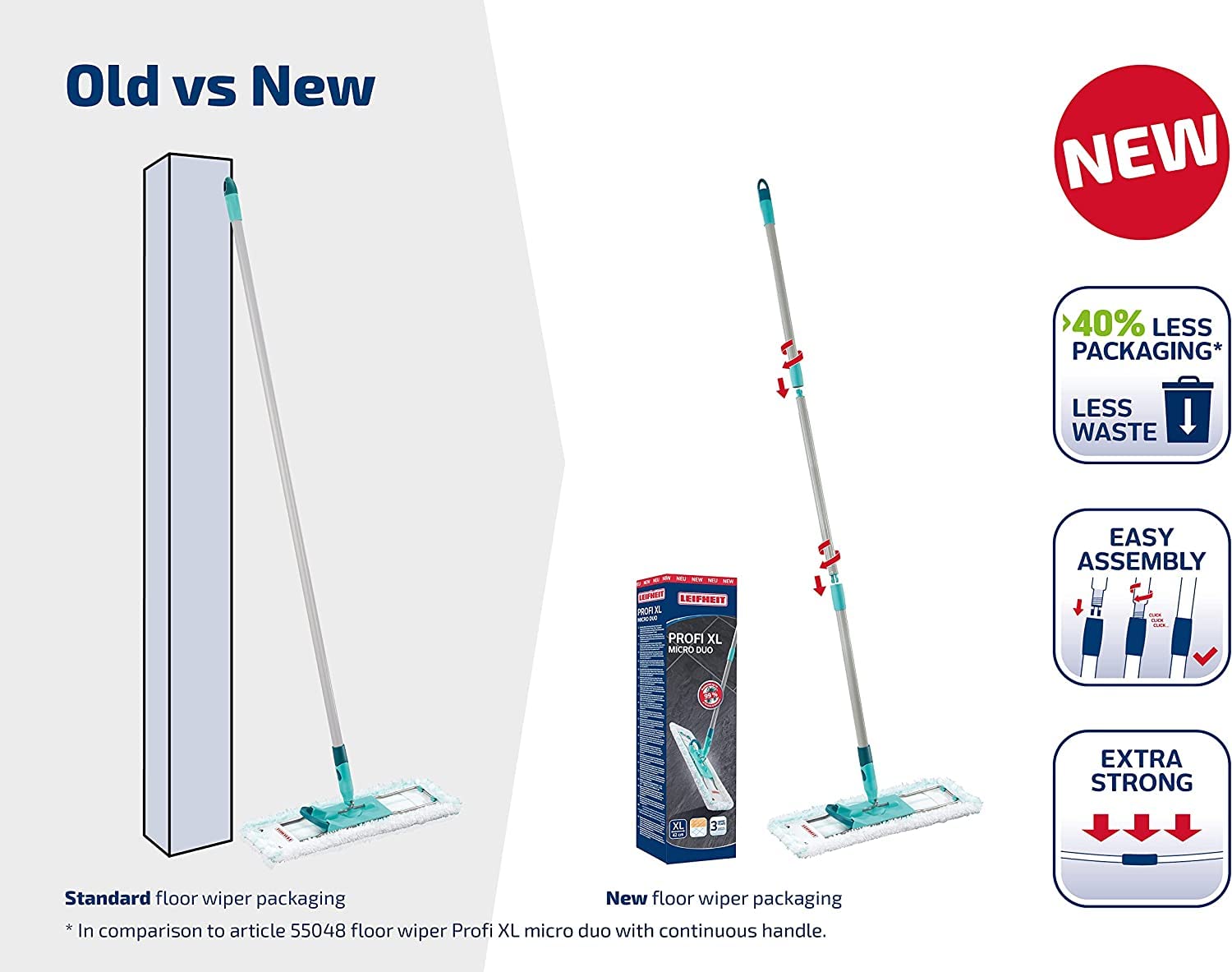 - Umweltfreundliche Verpackung - dank des stabilen 3-teiligen Stiels, benötigt der Wischmop 40% weniger Verpackung als sein Vorgänger und reduziert folglich den Verpackungsmüll