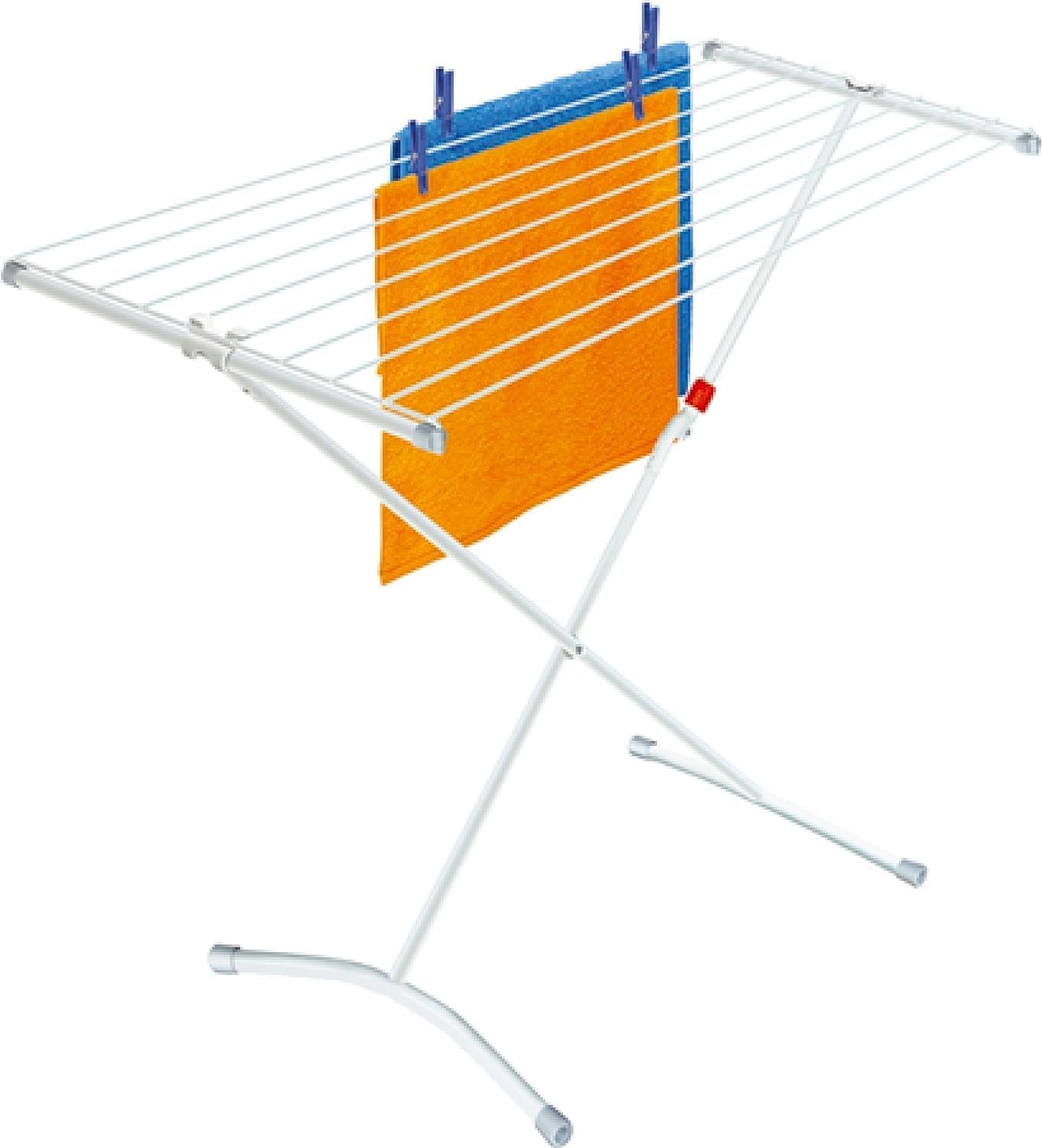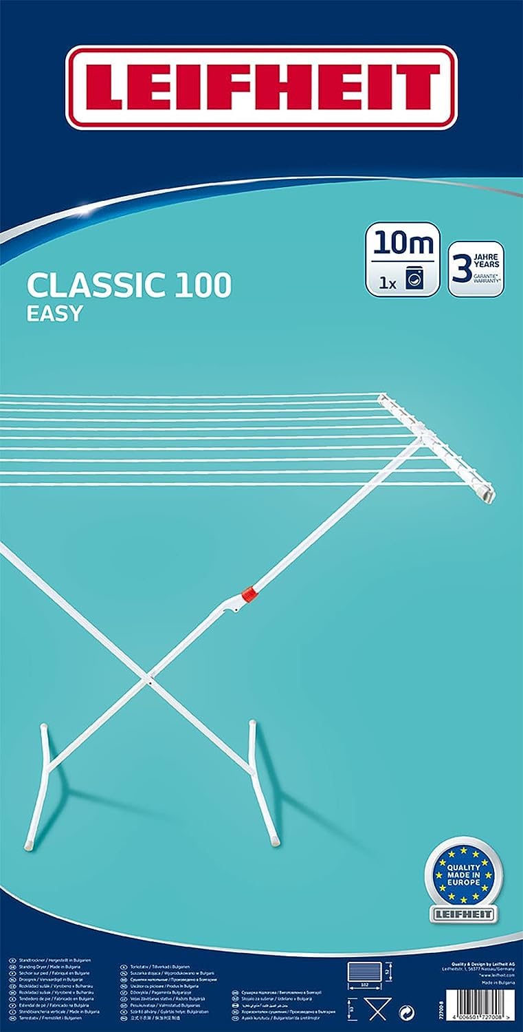 Der Leifheit Standtrockner Classic 100 Easy bietet alles für einen kompakten, stabilen und preisgünstigen Trockenplatz. Mit seinen 58 cm macht er sich schmal genug, um auf dem kleinsten Balkon, im engen Flur und sogar in der Badewanne Platz zu finden. Die Trockenstäbe bieten eine Länge von 10 Metern und damit Platz für eine ganze Waschmaschinenfüllung. Das Gestell ist mit einer Kindersicherung versehen und lässt sich einfach und schnell zusammenklappen.