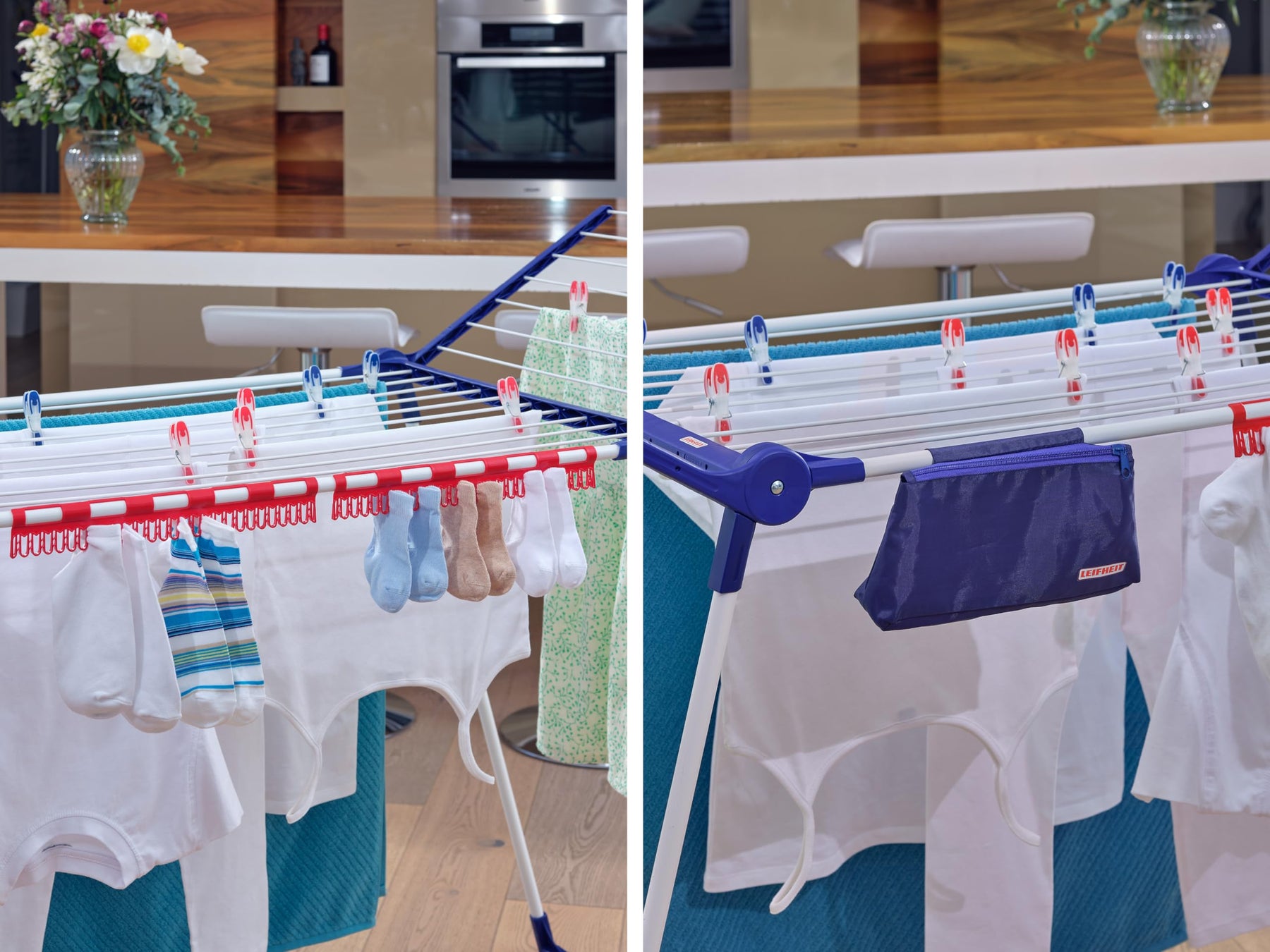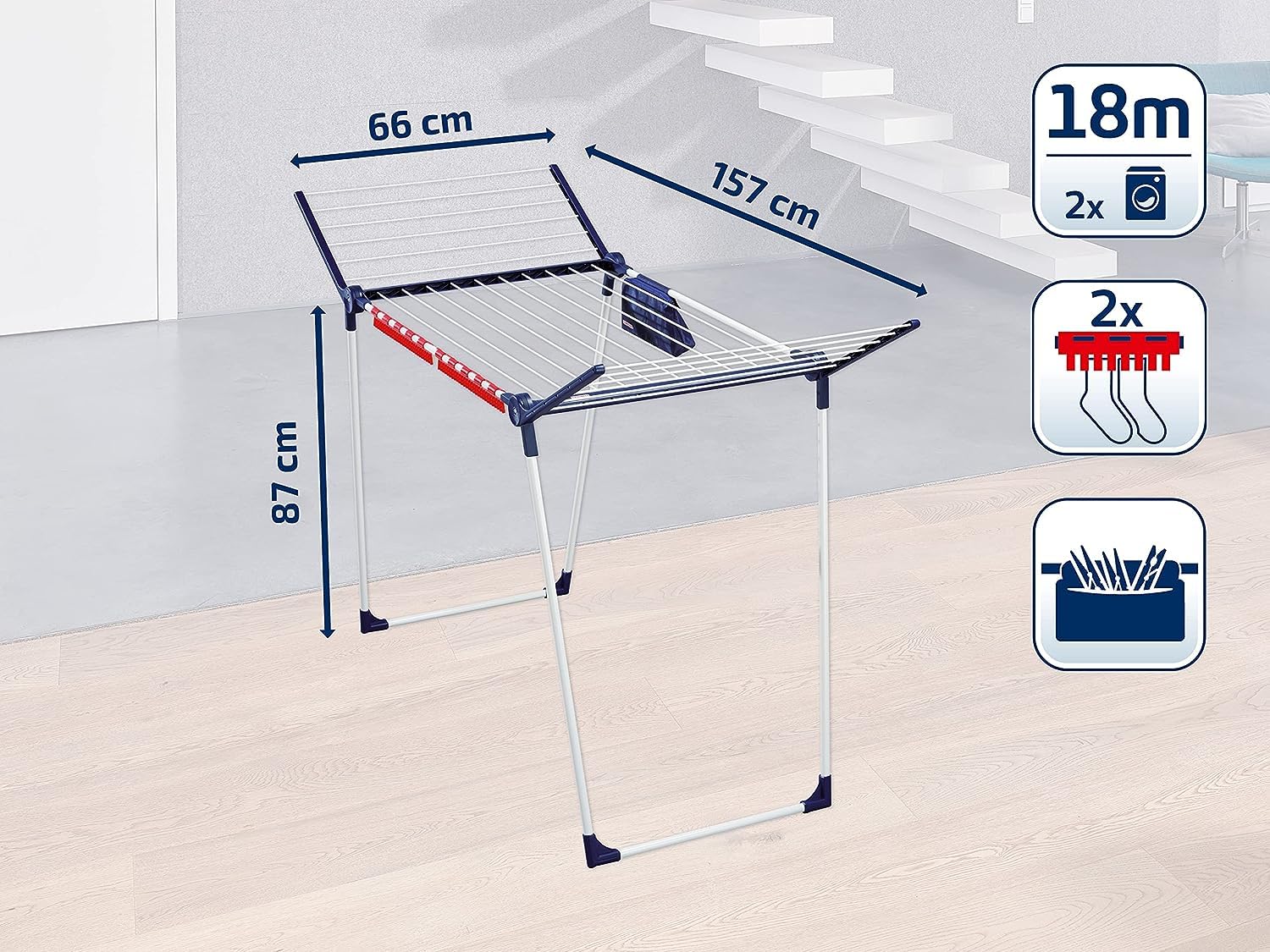 Die Produktvorteile im Überblick Parallele Beine für einen stabilen Stand 105 cm hohe Flügel für ein Aufhängen von langen Wäschestücken Platzsparendes Verstauen dank zusammenklappbarem Design Insgesamt 18 Meter Trockenlänge Mit 2 Kleinteilehaltern für schnelles Aufhängen ohne Wäscheklammern Dank enthaltenem Wäscheklammerbeutel sind Klammern immer griffbereit Durch rostgeschützte Ausführung ideal für den Innen- und Außenbereich