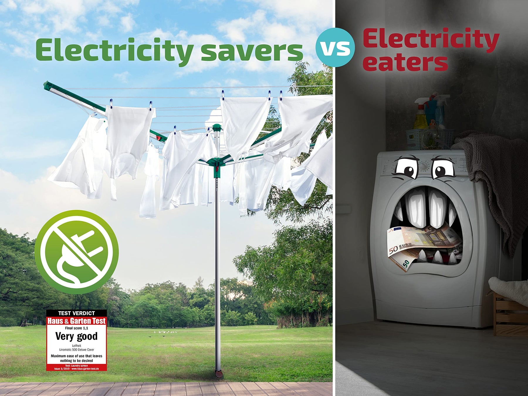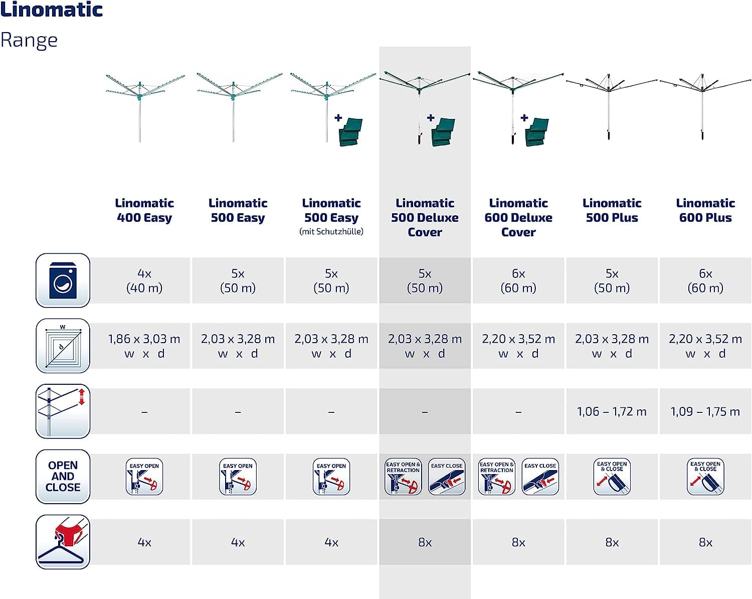 Das Wäschetrocknen im Garten hat viele Vorteile: Frisch duftende Kleidung, eine kurze Trockenzeit und viel Platz für die Kleidung der ganzen Familie. Besonders praktisch ist dafür ein Wäscheschirm, der platzsparend eingeklappt werden kann und bei dem Leinen und Wäschestücke immer sauber bleiben. Die Linomatic 500 Deluxe Cover bietet den ganzen Komfort für die große und aktive Familie: Saubere Leinen durch die Leifheit Leinenautomatik und eine Leinenlänge von 50 Metern, auf der bis zu 5 Waschmaschinenladungen Platz finden.