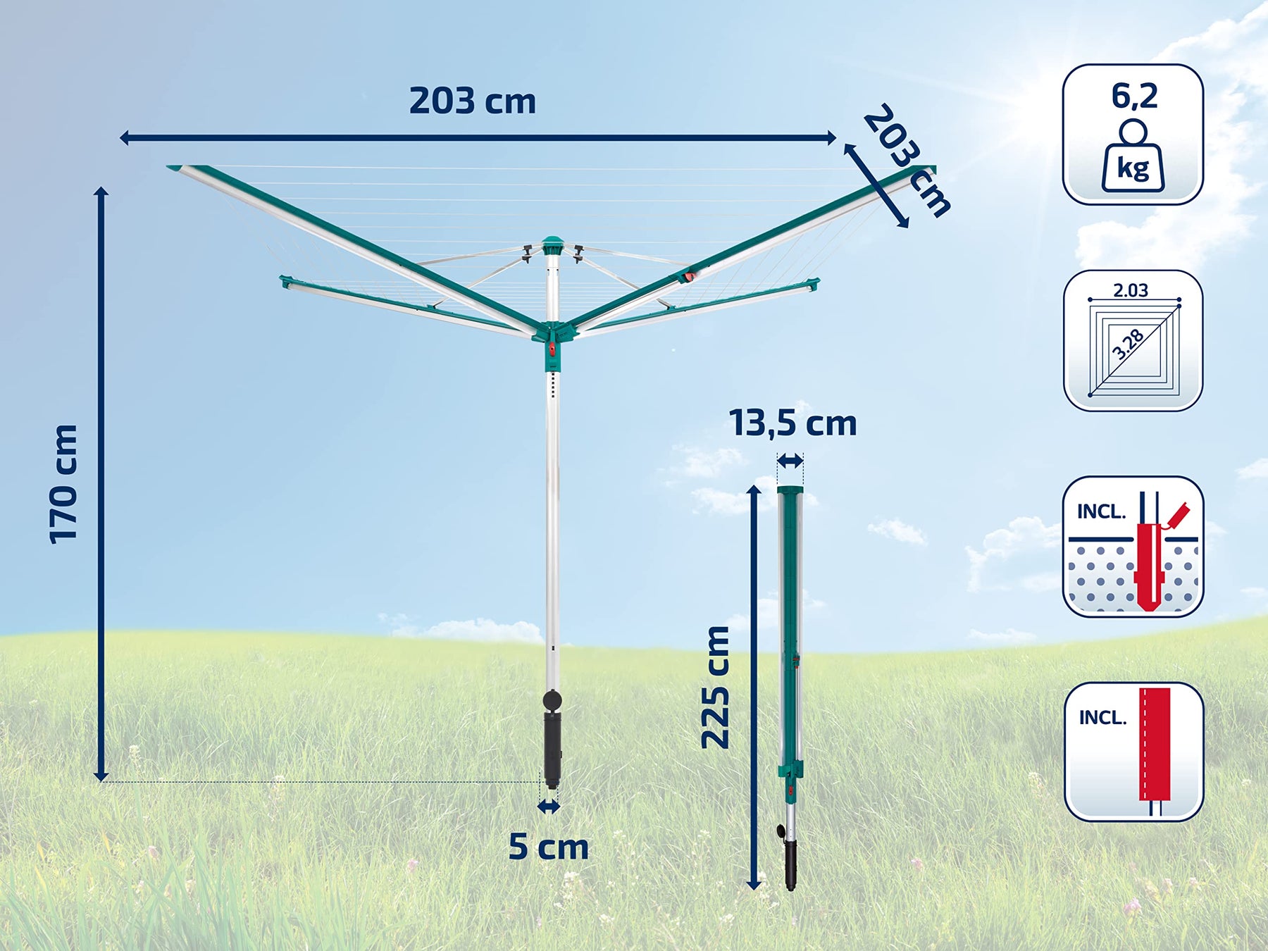 An jedem Tragarm befinden sich je zwei Bügelhalter zum faltenfreien Trocknen von insgesamt acht Hemden oder Blusen - die Kleiderbügel können einfach eingehängt werden. Durch die maximale Leinenlänge von 2,03 Metern finden auch große Wäschestücke wie Bettwäsche, Tischdecken und Gardinen einen Platz zum Trocknen. Alle eingesetzten Materialien des Wäscheschirms sind witterungs- und UV-beständig. Die Lieferung erfolgt inklusive Bodenhülse mit Deckel zum Einbetonieren. Made in Germany.