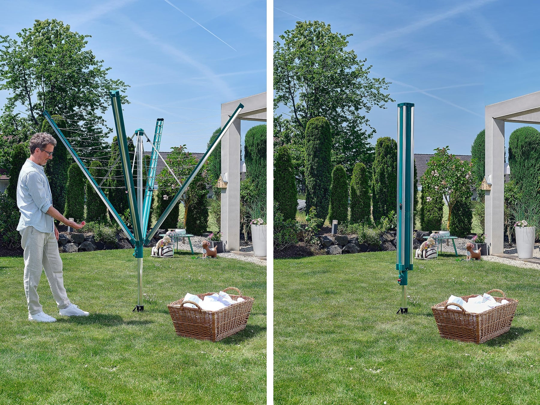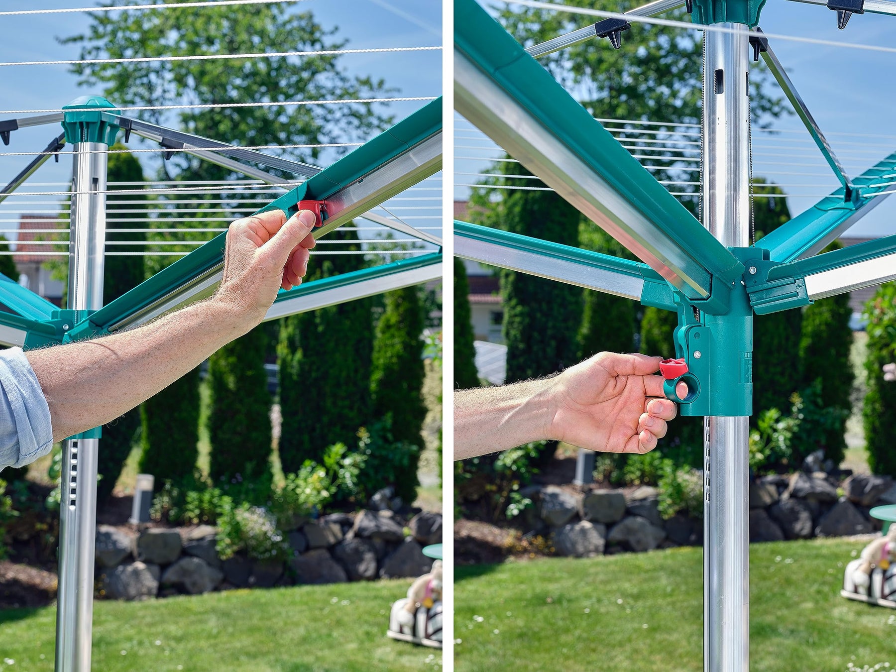 Das nochmals verbesserte Easy Lift System sorgt für ein müheloses Öffnen der Wäschespinne. Die Aufzugsleine wird außerdem automatisch mit eingezogen, um sie zu schützen und Schwierigkeiten beim Rasenmähen oder Stolpergefahr zu vermeiden. Auch das Schließen der Wäschespinne ist dank des Easy Close Comfort Systems besonders einfach: Die Drucktaste am Tragarm auf Augenhöhe ermöglicht ein leichtes Entriegeln und Zugleiten - mit nur einem Finger und sogar mit einem Kind auf dem Arm. Die Leinenautomatik sorgt für das automatisches Einziehen und Ausfahren der Leinen, sodass diese immer sauber bleiben. Die Wäschestücke bleiben so garantiert frei von Leinenstreifen wie sie bei herkömmlichen Wäscheschirmen vorkommen.