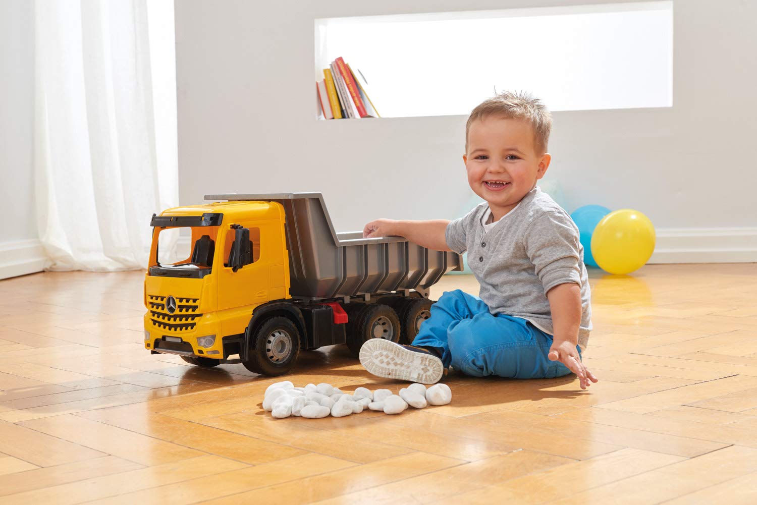 Lena 2064 Starke Riesen Muldenkipper Mercedes Benz Arocs, LKW ca. 63 cm, Kipplaster mit 3 Stahlachsen und 150 kg Tragkraft, Giga Truck gelb, schwarz, Silber, großer Kipper für Kinder ab 3 Jahre