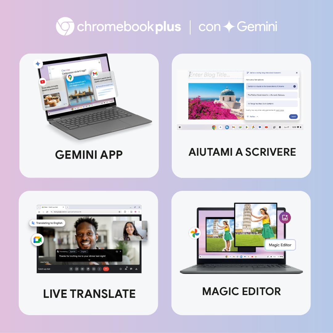• 💻 Dank der effektiven Leistung in jedem Bereich, der unvergleichlichen Sicherheit und der Magie von Gemini zur Förderung Ihrer Ideen helfen Chromebooks Ihnen, mit weniger Aufwand mehr zu erreichen.