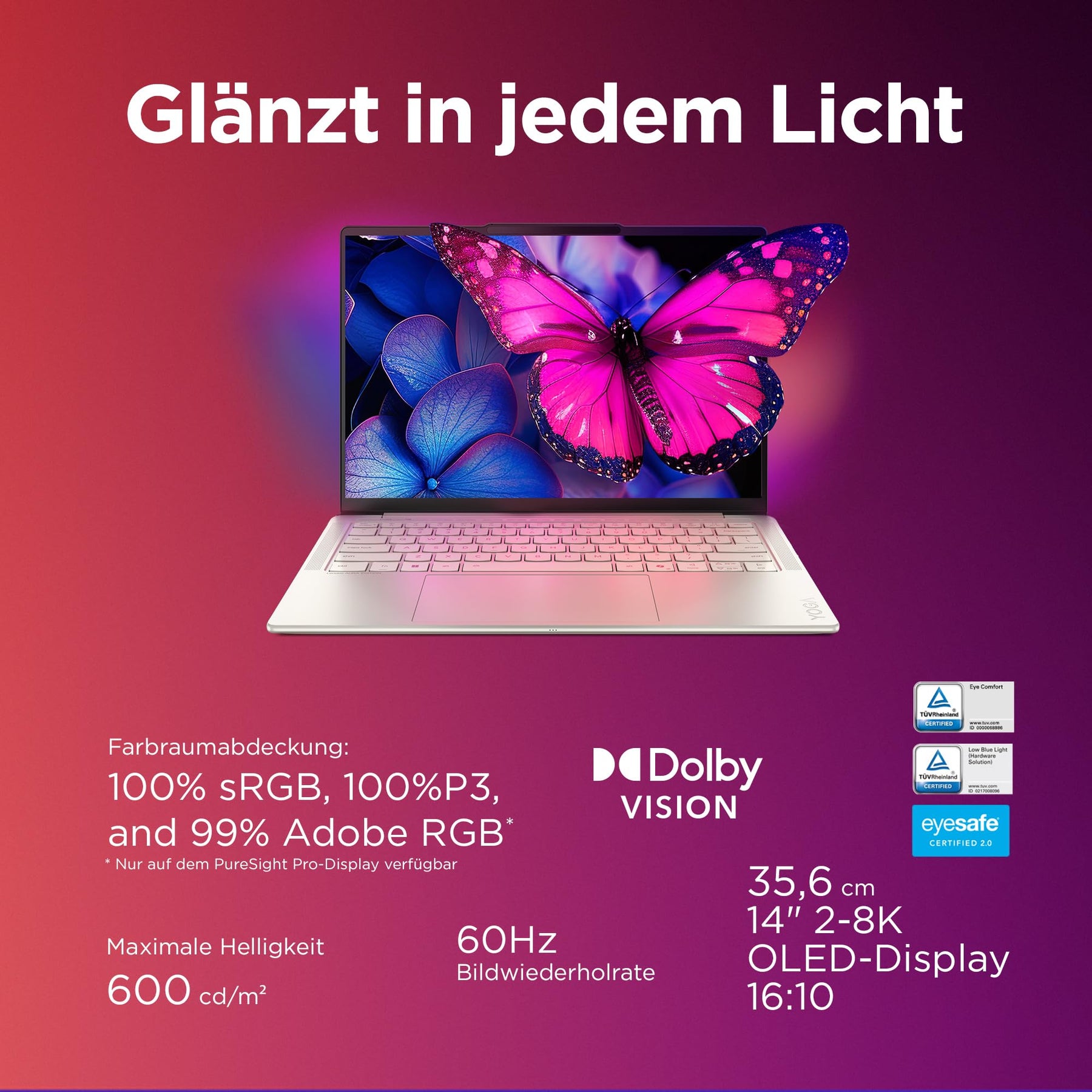 - Dieses 14" schlanke und leichte OLED-Notebook mit 100 % Farbraumabdeckung bietet exklusive Smart Experiences von Lenovo – darunter Smart Modes zur Leistungsoptimierung und Smart Share für nahtlose Verbindungen. Mit dem Intel Core Ultra Prozessor für müheloses Multitasking, umfassender Anschlussvielfalt inklusive HDMI, 24/7-Support über Smart Care sowie ganztägiger Akkulaufzeit ist es der ideale Begleiter für Ihren mobilen Alltag.