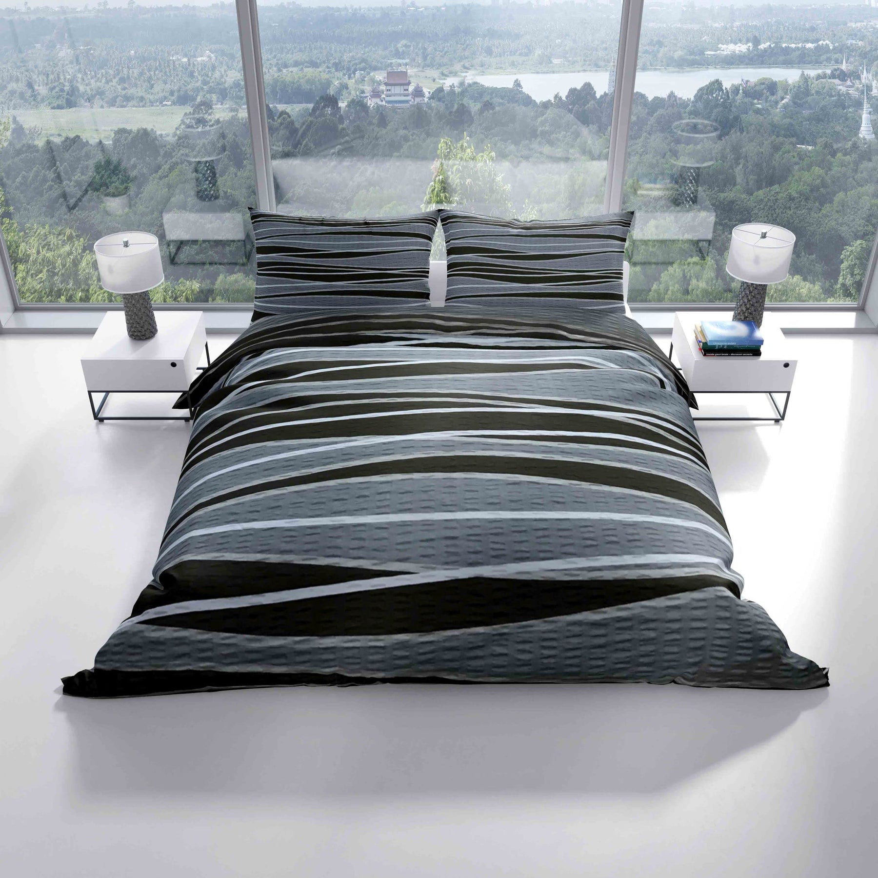 - Leonado Vicenti - 4teilig Bettwäsche Seersucker 135x200 cm oder 155x220 cm mit Reißverschluss, Größe:135 x 200 cm, Farbe, Design:Schwarz Welle