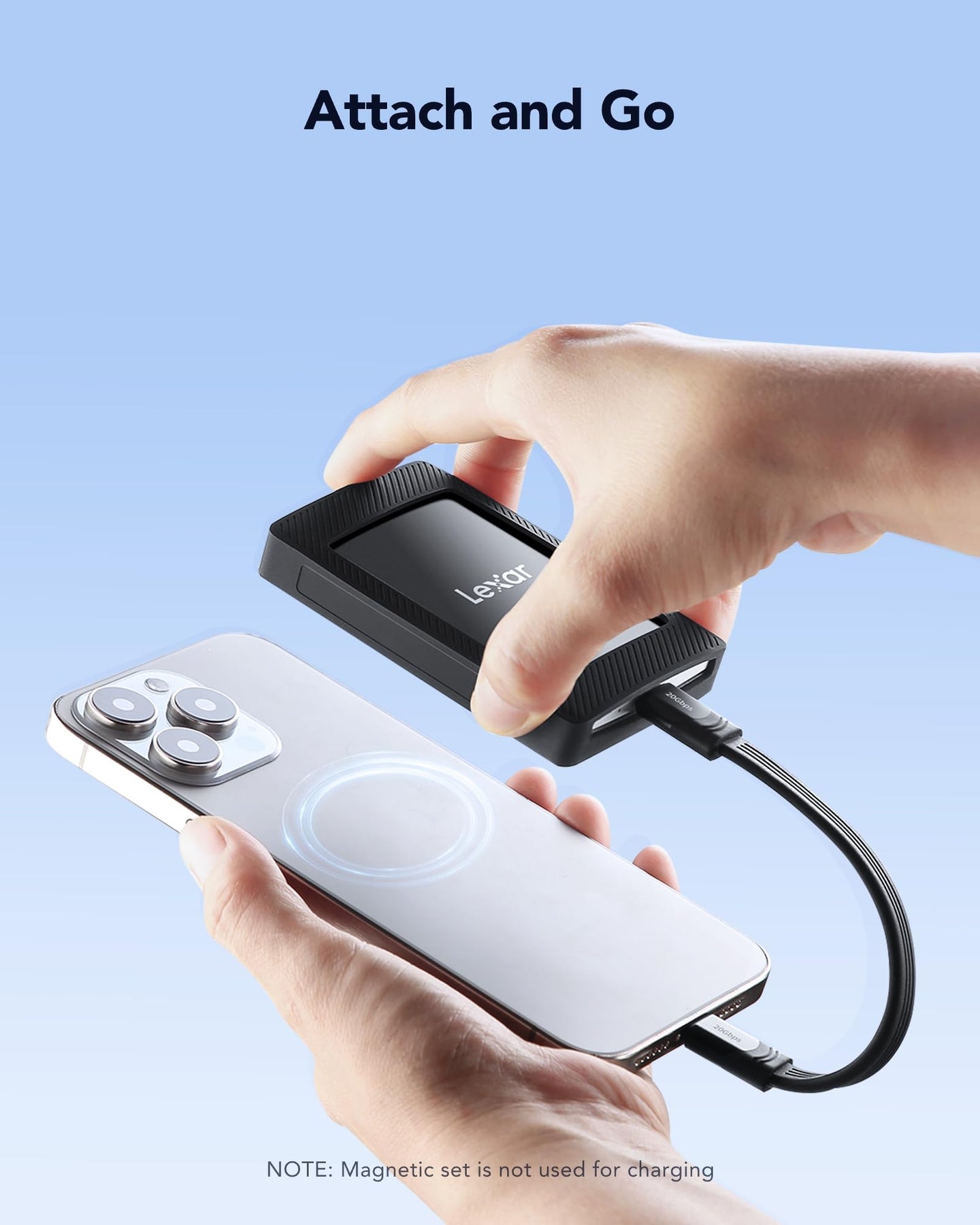 - -Snap and Go: Die Lexar Externe SSD SL500 wird mit einem magnetischen Kit geliefert, mit dem sie einfach an Ihrem iPhone der 15er Serie mit einer magnetischen Silikonhülle befestigt werden kann, oder wenn Ihr Telefon eine Hülle trägt, haben wir einen magnetischen Ring, der befestigt werden kann! (Hinweis: Magsafe Wireless Charging wird NICHT unterstützt)
