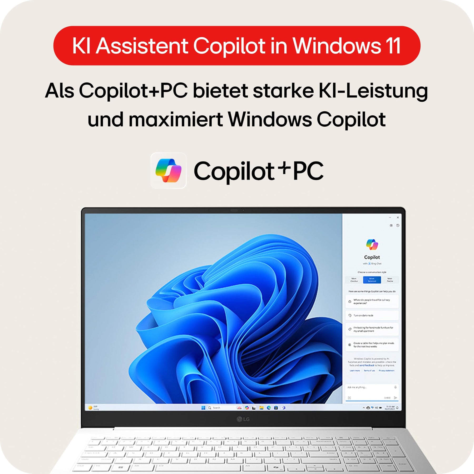 Einzelheiten: Sowohl Produktivität als auch Unterhaltung profitieren von der starken Leistung des Intel Core Ultra 7 Prozessors mit integrierter Intel Arc Grafiklösung. Zusätzlich unterstützt das Notebook im Alltag mit der speziellen Software-Lösung gram AI, die beispielsweise Systemeinstellungen vereinfacht oder den Inhalt von Dokumenten zusammenfasst – und viele KI-Berechnungen direkt auf dem Gerät ausführt. Ebenso stark ist die Darstellung auf dem entspiegelten IPS-Display mit 99% DCI-P3, 400 cd/m² Helligkeit und nativer WQXGA-Auflösung (2.560 x 1.600 Pixel). Trotz all dieser Funktionen ist das LG gram Pro mit einem Gewicht von lediglich 1.369 Gramm besonders mobil und dank seines widerstandsfähigen Gehäuses und der starken Akkuleistung überall dabei.