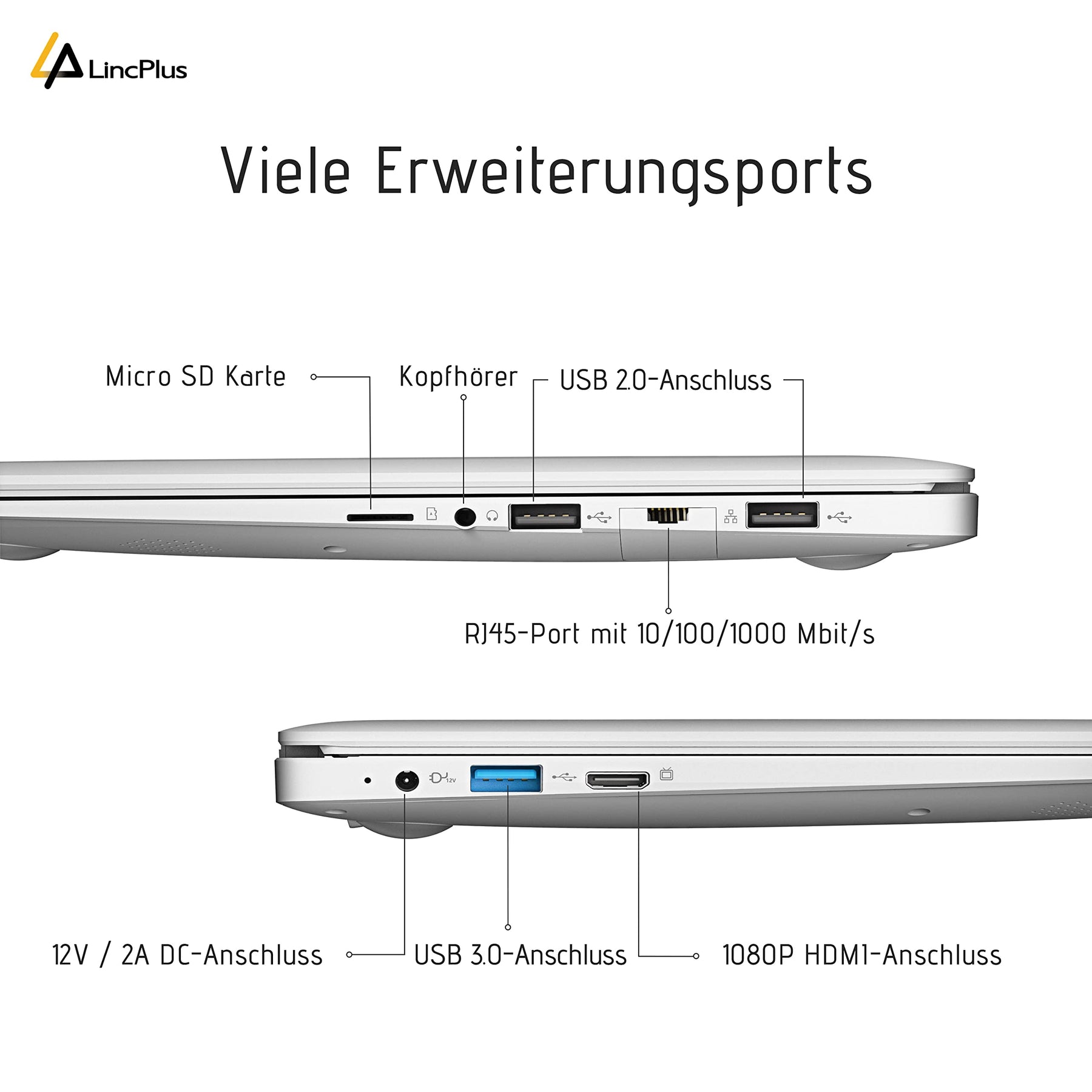 - Das ultrabook LincPlus P3 ist mit zahlreichen Ports ausgestattet, RJ45 x1, USB 3.0 x1, USB 2.0 x2, Micro SD Slot x1, SSD 2.5 SATA x1, Mini HDMI x1