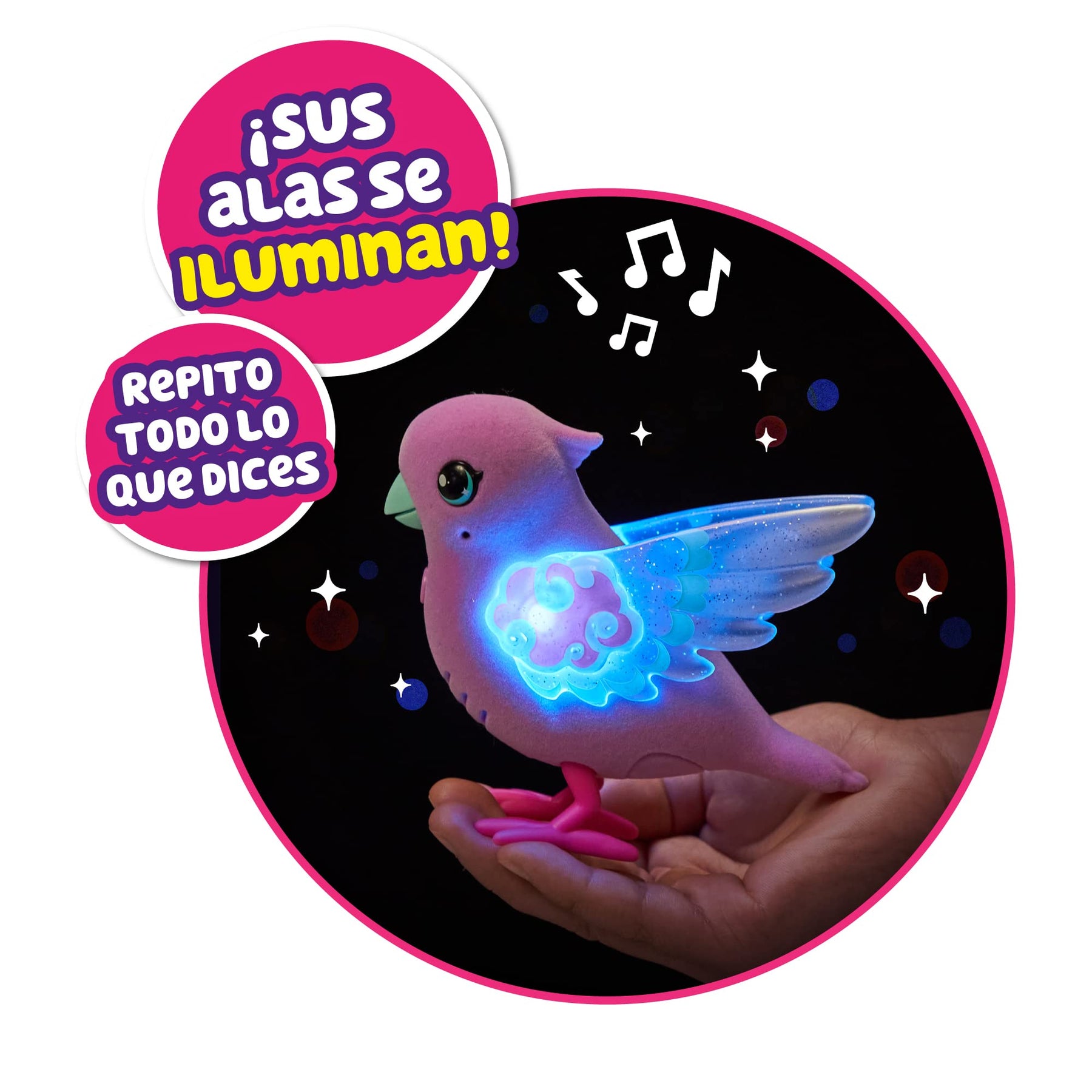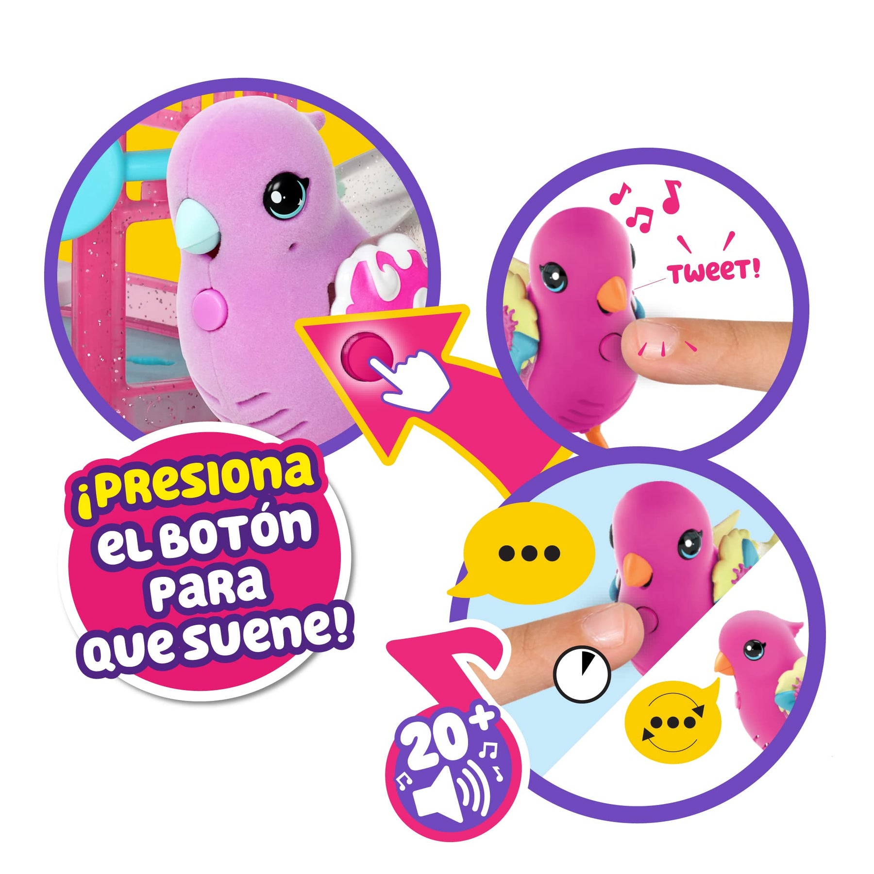 Die Parlanchvögel sind zurück! Die Parlanchvögel sind mit zwei neuen Modellen zurück, Skyler und Twinkle. Diese kleinen Vögel wiederholen, was Sie sagen. Entdecken Sie diese niedlichen Haustiere, die aufnehmen, was sie hören, und spielen es mit einem sehr lustigen Ton. Außerdem pfeifen, ficken und machen sehr fröhliche Ausdrücke. Insgesamt haben sie über 20 verschiedene Vogelgeräusche und -reaktionen. Diese kleinen Vögel leuchten auf, wenn sie den Knopf auf ihrem Bauch drücken und wiederholen, was Sie sagen. Sie haben wunderschöne Designs auf ihren Flügeln, mit sehr unterschiedlichen Themen je nach Persönlichkeitsthema. Skylers Flügel sind am Sternenhimmel der Nacht und die von Twinkle in den Meeresgewässern, weil sie es liebt, über den Ozean zu fliegen. Je mehr Sie sich um sie kümmern und sie lieben, desto mehr singen und erfreuen sie sich über den Tag mit ihren schönen Klängen. Jungen und Mädchen werden lachen und viel Spaß beim Spielen mit diesen kleinen Vögeln haben. Außerdem gibt es auch das Modell Polly, ein weiterer Parlanchenvogel, aber dieser kommt in einem Käfig, damit Sie ihn überall verstauen und mitnehmen können. Die Polly Flügel haben ein sehr schönes Design mit Glitzer und einem rosa Wolkendetail und leuchten in verschiedenen Farben. Zum Spielen auch im Dunkeln. Sammeln Sie alle Modelle, um alleine oder mit Freunden zu spielen.