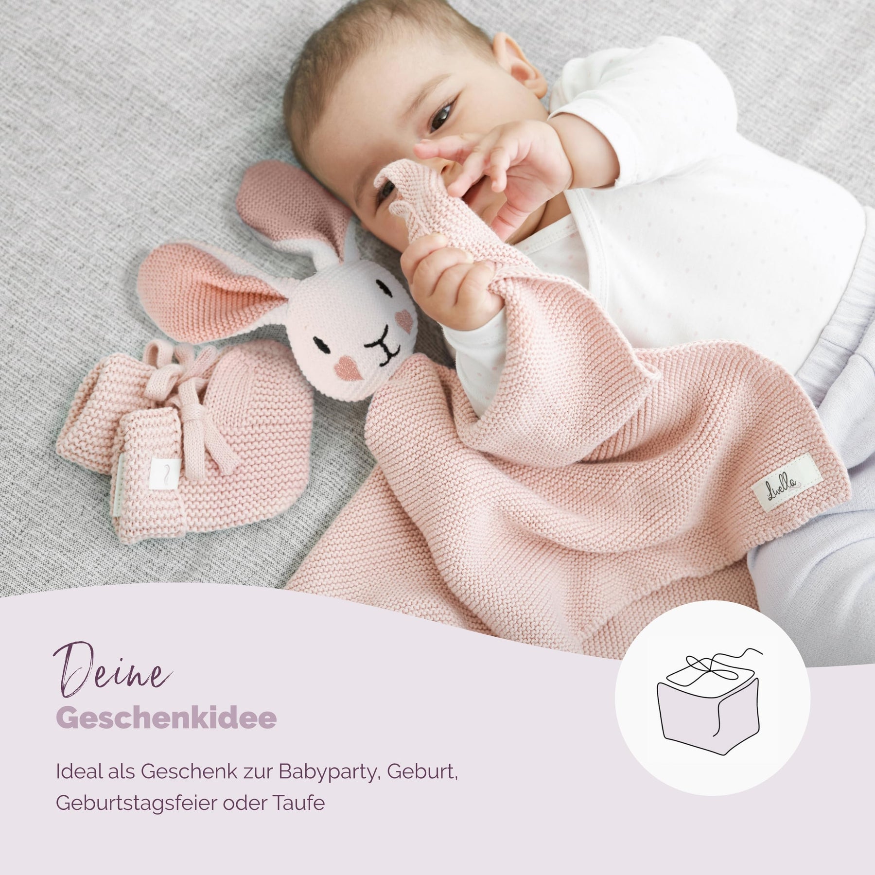 • ✅ 𝗟𝗜𝗘𝗕𝗘𝗩𝗢𝗟𝗟𝗘𝗦 𝗗𝗘𝗦𝗜𝗚𝗡: Die Schmusedecke mit dem liebevoll gestalteten Kuschelhasen hat ein Maß von 40 × 40 cm. Die Erstlingssocken und das Kuscheltuch bestehen aus samtweicher Bio-Baumwolle in einem zeitlosen Strickmuster. Beide Produkte lassen sich gut bei 30° C waschen.