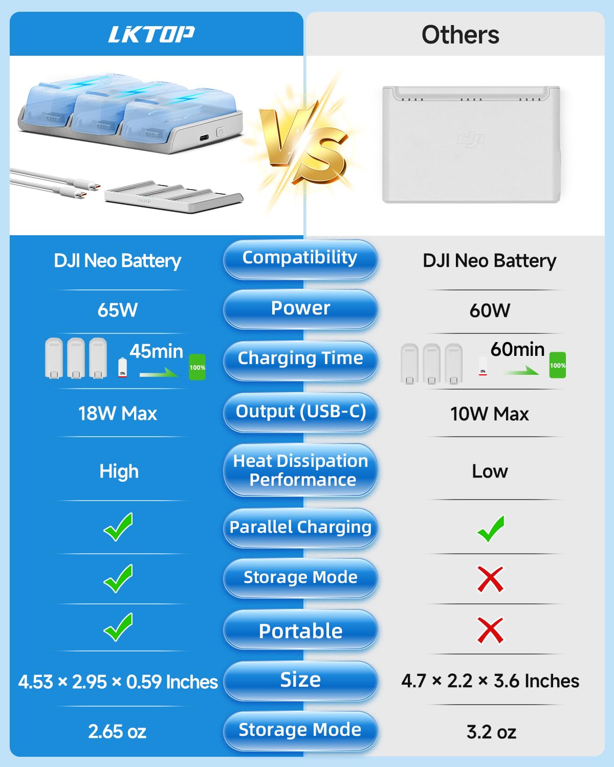 - ⚡【Schnelles Laden】Erleben Sie schnelle Leistungssteigerungen für Ihre DJI-Neo-Akkus mit dem LKTOP Neo Zwei-Wege-Ladehub mit 65 W Eingangsleistung zur Unterstützung des Schnellladens, sodass Sie mit Vertrauen fliegen und atemberaubende Aufnahmen in kürzester Zeit aufnehmen können.